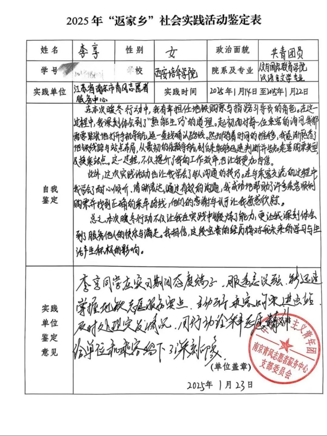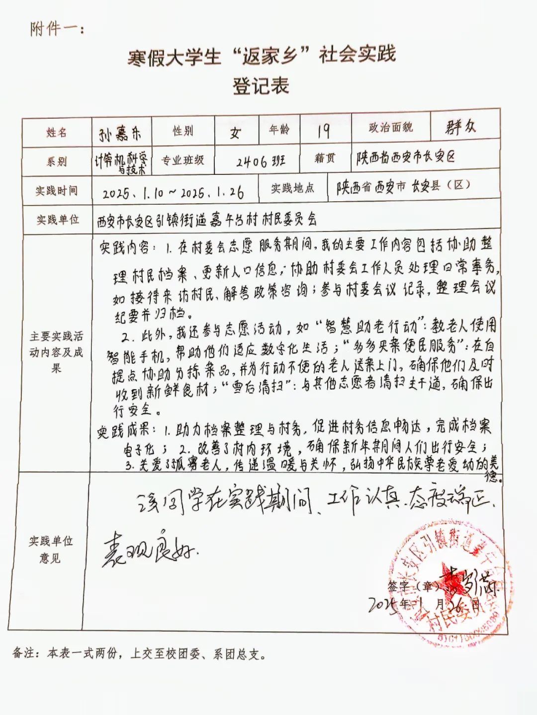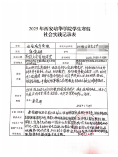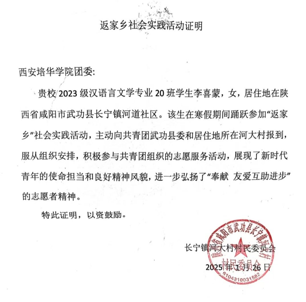 为响应时代号召,西安培华学院团委积极组织“返家乡”社会实践活动,为2025年寒假大学生打造实践平台。帮助引导学生树牢理想信念、提高社会化能力,激发投身基层、服务家乡的深厚情怀,推动共青团实践育人工作深度融入高校“大思政课”建设。
