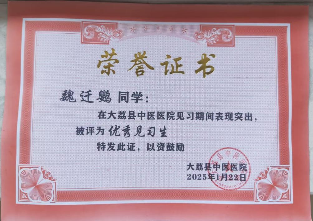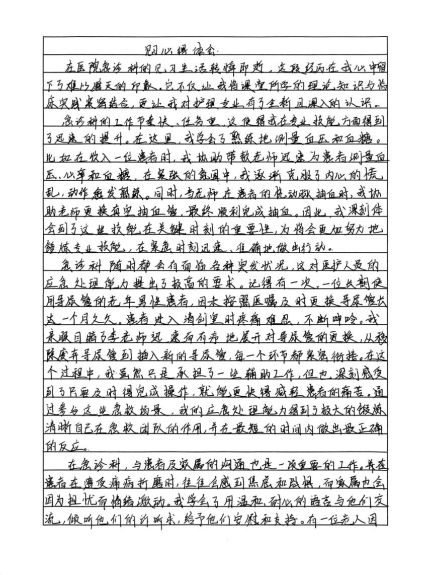 充分运用课堂所学知识,将人文关怀融入到对老年患者的日常护理之中。耐心倾听他们的诉求,关注每一个细微的情绪变化,让患者在住院期间始终保持积极的心态,以利于病情的康复。我的努力得到了带教老师的认可,也收获了患者及其家属的一致好评,最终被评为“优秀实习生”。