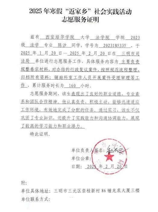 主要负责整理社区矫正人员案卷、录入电子化信息、笔录调解案件、归档矫正材料,全力维护司法所日常运转,短短两周经手整理 10 余宗档案。1 月 20 日至 2 月 20 日来到三明市司法局行政复议二科室,辅助科室同事开展行政复议工作,参与规整卷宗、协助起草 3 份行政复议决定书,每次都严谨对待,与团队深入研究法条。这累计40 余天、240 小时的实践,让我深切体会到理论与实践结合的重要性,从案件整理到法律文书起草,不仅提升了专业技能,更磨炼了自己严谨负责的工作态度,坚定未来在法学道路上砥砺前行的决心。