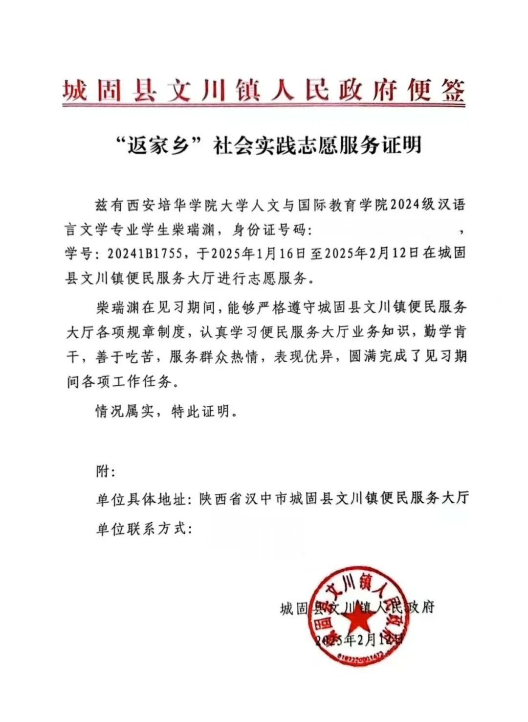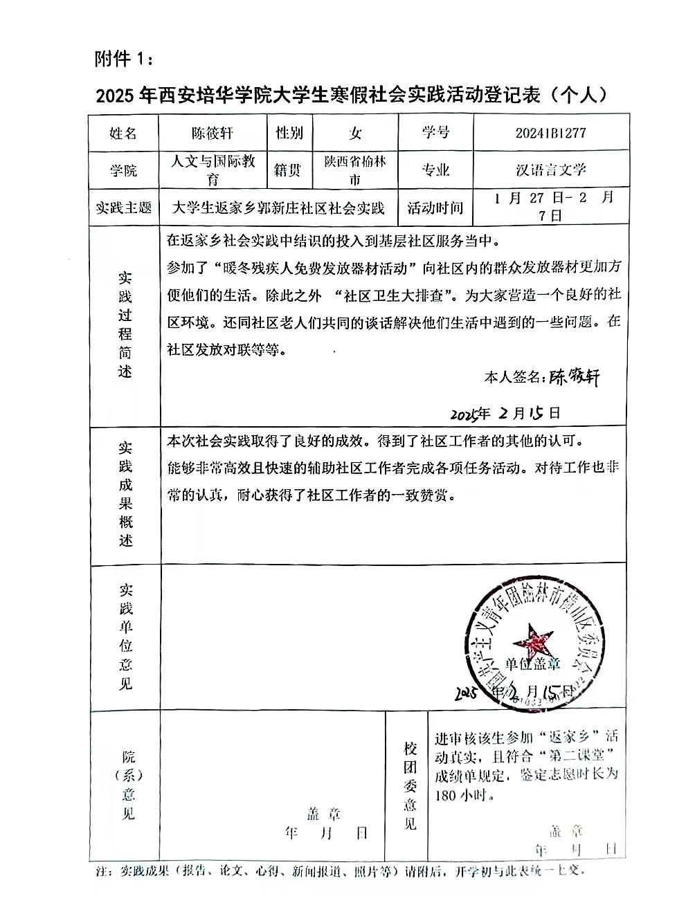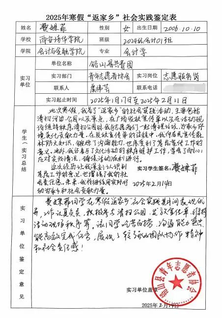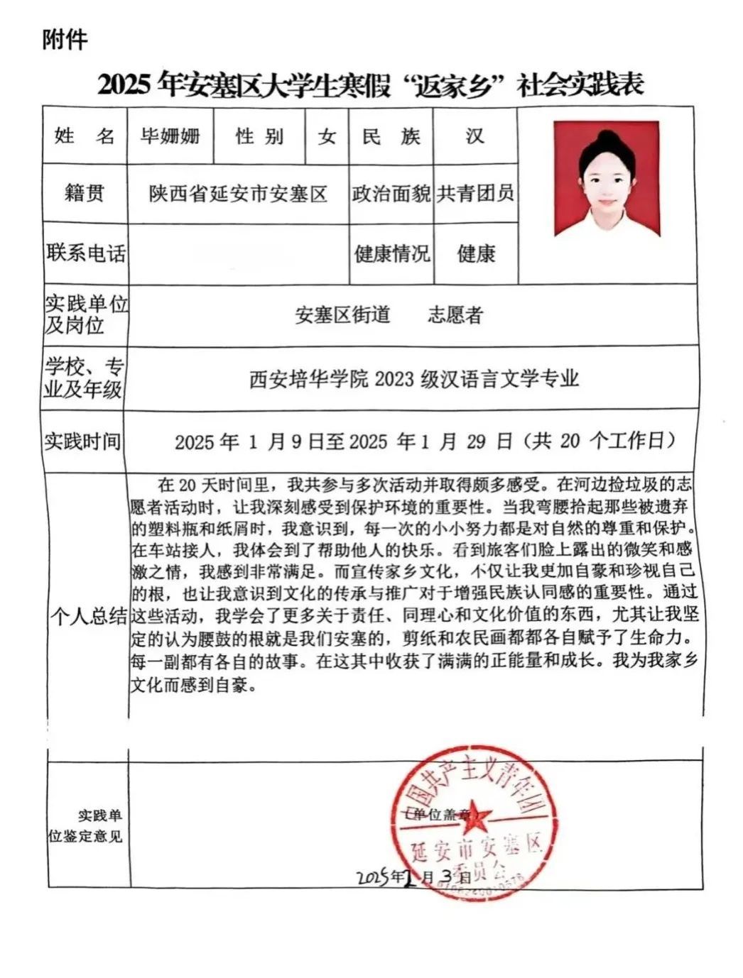为响应时代号召,西安培华学院团委积极组织“返家乡”社会实践活动,为2025年寒假大学生打造实践平台。帮助引导学生树牢理想信念、提高社会化能力,激发投身基层、服务家乡的深厚情怀,推动共青团实践育人工作深度融入高校“大思政课”建设。