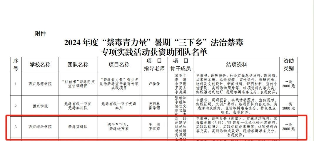 西安培华学院禁毒宣讲队,开展“携手三下乡,禁毒进万家”项目在本次专项实践活动中表现出色。他们围绕禁毒主题,开展了形式多样的宣传教育活动队员们通过街头调研、设立咨询点等方式走进社区,并在此基础上增设体验VR禁毒宣教机,分发禁毒防艾宣传手册、在社区拜访仿真毒品及文创周边等多种形式进行禁毒防艾知识宣讲。实施计划具体可行、调研扎实细致、宣教新颖多样、实践富有实效,荣获“一类资助。”