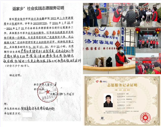 实践心得:在本次社会实践活动过程中,我的实习部门是青年志愿者工作部,实习岗位是综合服务岗。在春节期间,车站往往是人流量最大的地方之一,旅客们可能会遇到各种困难和不便,如购票难、行李多、路线不熟悉等。而我们青年志愿者的主要任务就是为旅客们提供购票咨询、行李搬运、路线指引等服务,帮助他们解决旅途中的困难。同时,我们也会送上自己准备的小礼物和祝福,让旅客们在寒冷的冬日里感受到一份温暖和关爱。最后,我们还负责县委组织的“来洛南赶大集,品山城烟火味”活动和招商引资大会的组织召开、维持秩序等工作。家乡的繁荣兴盛离不开我们每一位人。我们青年大学生更应从先辈们手中接过“接力棒”,承担起繁荣家乡的重担。回首这一个月的社会实践活动,我收获满满。这次活动让我在实践中锻炼了自己的组织能力、沟通能力和服务意识,弘扬了“奉献、友爱、互助、进步”的志愿精神。我希望能够继续参与更多的社会实践活动中去,用自己的双手为社会创造更多的价值。