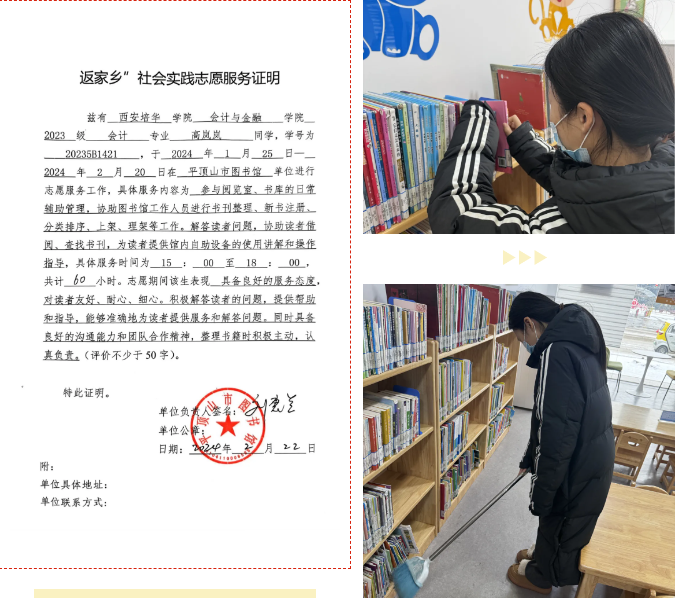 为深入贯彻落实习近平总书记在同团中央新一届领导班子集体谈话时的重要讲话精神,切实肩负起新时代新征程党赋予的使命任务,充分激发广大青年在中国式现代化建设中挺膺担当,西安培华学院团委积极开展寒假“返家乡”社会实践活动,引领返乡的培华青年积极参与家乡建设,以家乡沃土培育青春梦想,用青春力量推动家乡发展,用实际行动践行青年担当。下面就让我们一起走进他们的实践故事吧!