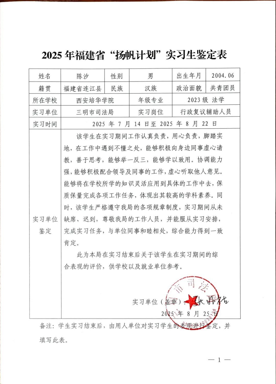 心得体会:执笔协助起草行政复议决定书、行政诉讼答辩状,于字句推敲间淬炼“以事实为依据、以法律为准绳”的法治思想;严谨归档数百案卷,以零差错程序坚守筑牢正义基石;辅审案件研讨,体悟行政复议“监督权力、救济权利”的治理智慧。四十日基层淬炼,将抽象法条化为鲜活实践,更深刻领悟“法治建设重在基层”的时代内涵。身为新时代法学青年,定当铭记嘱托,以此次实习为起点,将专业素养与为民情怀熔铸于学业精进,以挺膺之姿投身法治中国建设,助力公平正义之光照彻闽山闽水。