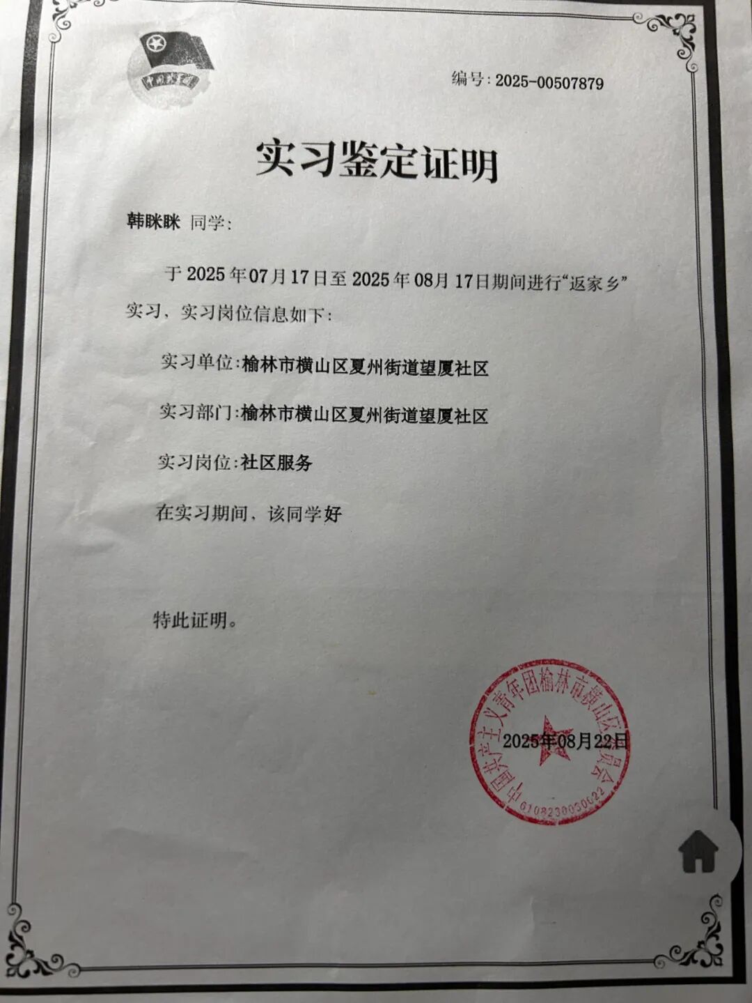 见习内容:社会实践期间,参与社区便民服务,为居民发放食用盐并科普健康用盐知识;担任横山区篮球比赛志愿者,负责场地引导、秩序维护及物资协调;作为横山区陕北陕南文化交流志愿组织成员,协助布置活动场地、引导嘉宾互动,促进地域文化沟通;参加“返家乡”社会实践培训,提升服务技能与责任意识,结合培训内容优化志愿服务流程,增强基层服务实效。此外,参与社区老年人和儿童关怀活动,协助开展健康讲座、心理疏导,并协助整理居民需求反馈,为社区服务改进提供参考。