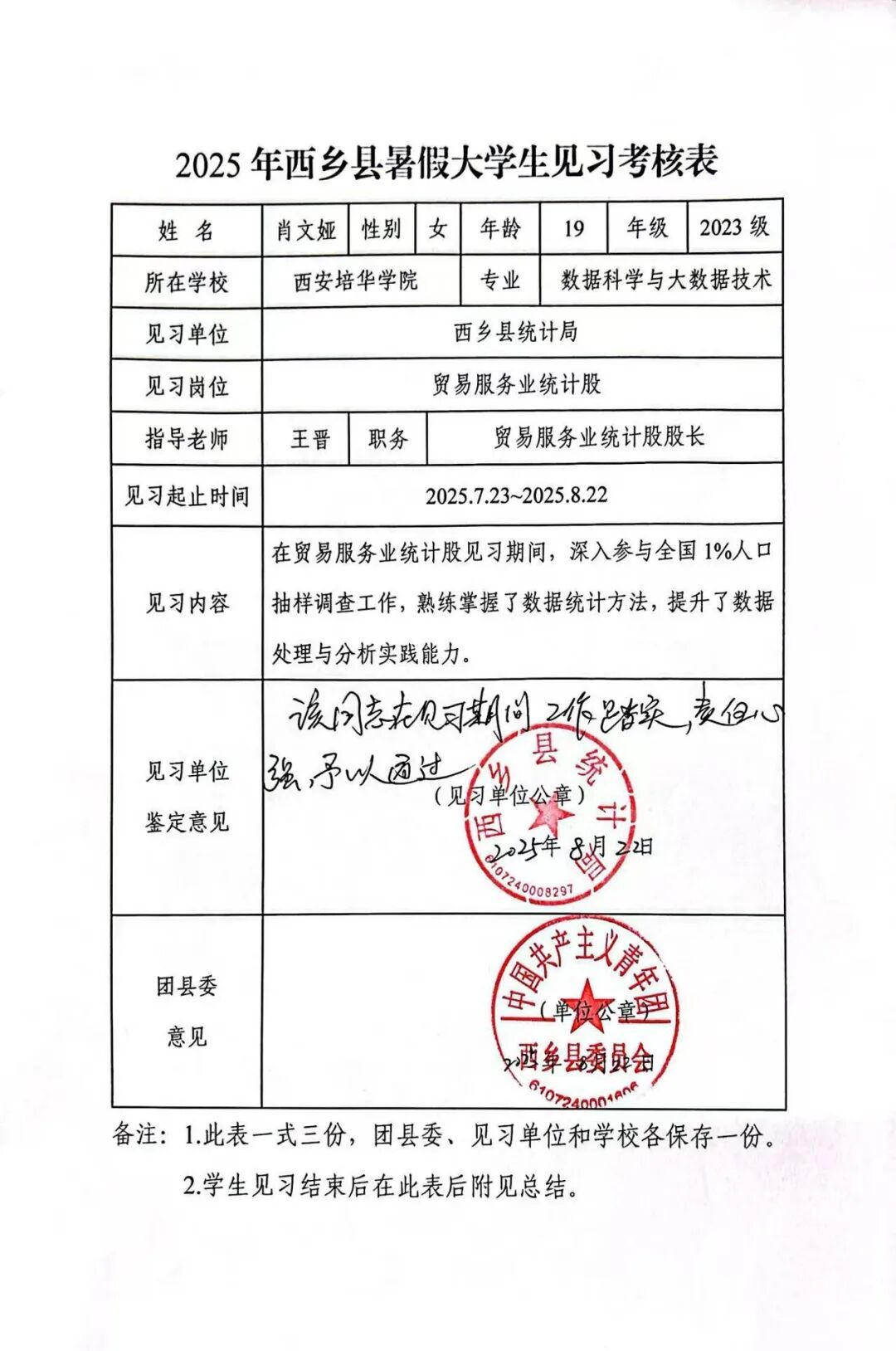 心得收获:在西乡县统计局见习期间,我对统计工作有了全新认知:它并非简单数据加总,而是需经大量核实、比对与论证,是国家决策和社会管理的重要依据。我将课堂上的统计学、数据库知识用于实践,锻炼了Excel高级功能运用等技能,切实体会到“纸上得来终觉浅,绝知此事要躬行”,也深知数据初始环节质量把控的关键。同时,我养成细致负责的态度,明白统计工作不容差错;也感受到团队协作的重要性,学会主动沟通配合。通过处理乡镇数据,我了解到基层工作的不易与西乡县城乡建设情况,为参与全国性国情国力调查自豪,增强了社会责任感。我也发现自身不足,如专业统计软件运用不熟练、对部分经济指标理解不深。感谢西乡县统计局提供机会及领导老师指导,这段经历让我明确职业规划,未来我会努力提升能力,为服务社会奠基。