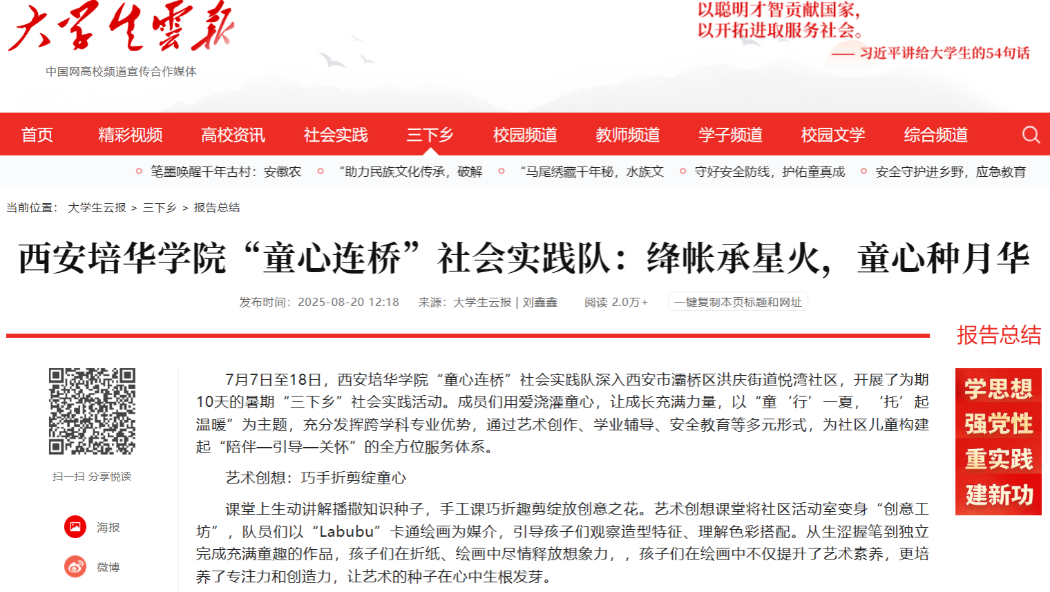 7月7日至18日,西安培华学院“童心连桥”社会实践队深入西安市灞桥区洪庆街道悦湾社区,开展了为期10天的暑期“三下乡”社会实践活动。成员们用爱浇灌童心,让成长充满力量,以“童‘行’一夏,‘托’起温暖”为主题,充分发挥跨学科专业优势,通过艺术创作、学业辅导、安全教育等多元形式,为社区儿童构建起“陪伴—引导—关怀”的全方位服务体系。
