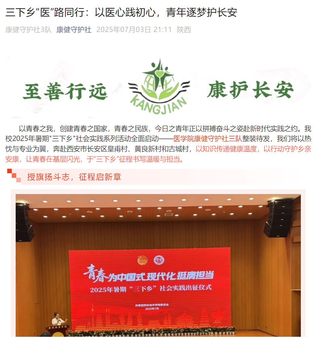 康宁守护先锋队赴平凉市灵台县开展暑期社会实践。团队围绕“医路护航助振兴·资助育人践初心”主题探访灵台多地,创新性地探索“医脉传承+乡村振兴”模式。以“医养结合+政策普及”为轴,为居民健康把脉,更为乡村教育播撒希望。开展义诊服务、资助政策解读、健康大讲堂共60场、服务覆盖超2000人;荣获表扬信与社会实践证明共24封。累计投稿568篇,被央广网、中华网、陕西青年融媒体中心、今日头条、平凉日报、平凉融媒体中心、灵台文旅、灵台县皇甫谧中医院等平台报道总阅读和点击量超120万。团队以实际行动诠释“知识改变命运,爱心回馈乡土”的新篇章,展现医学青年的责任与担当。