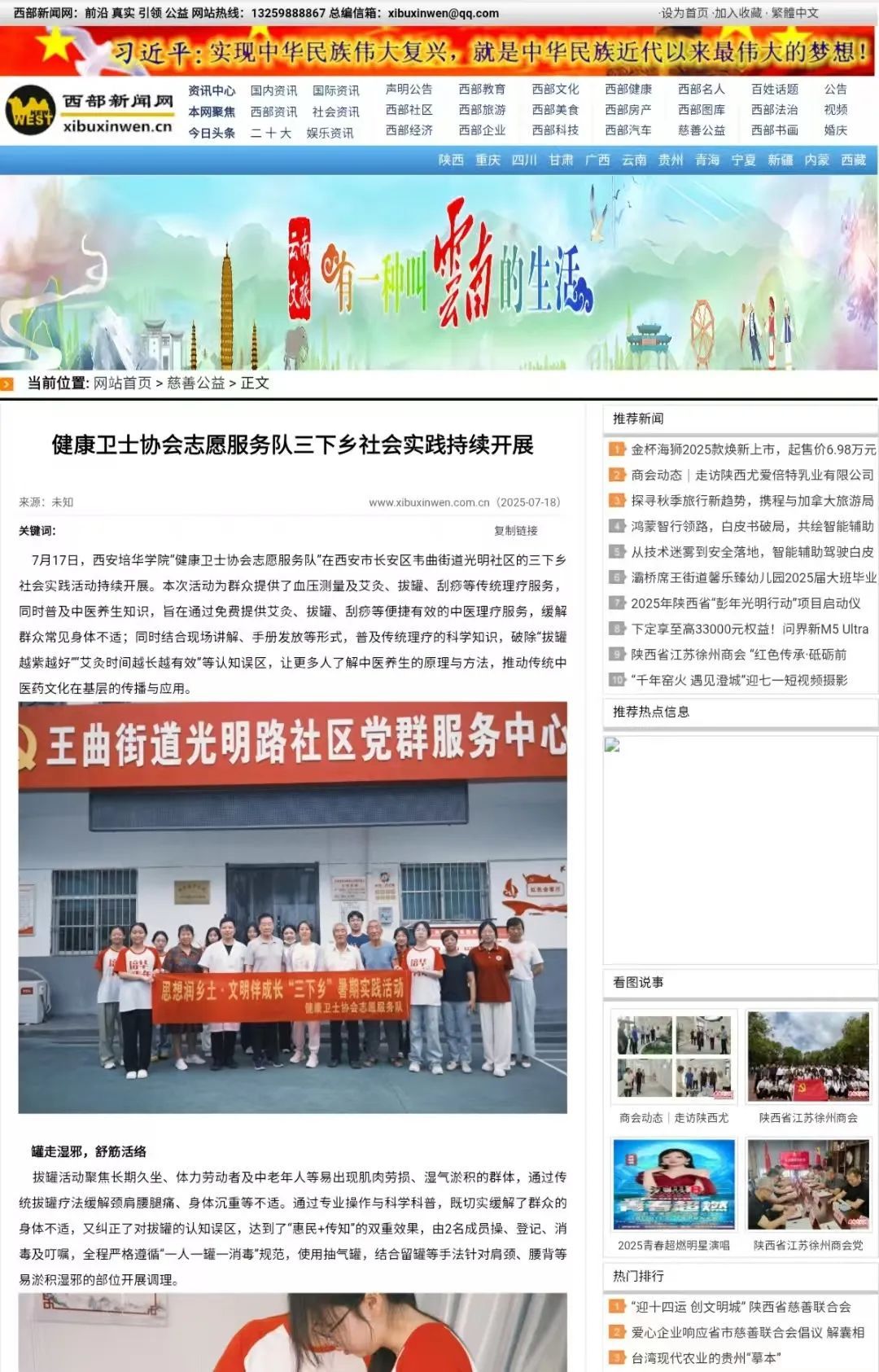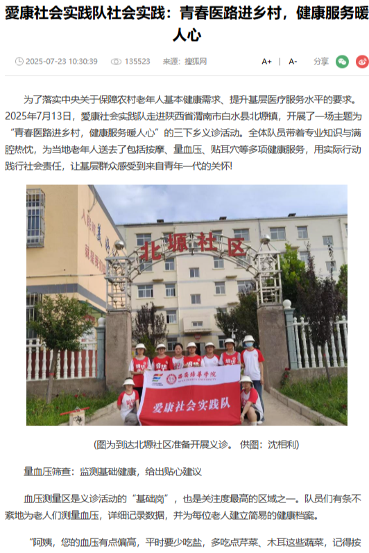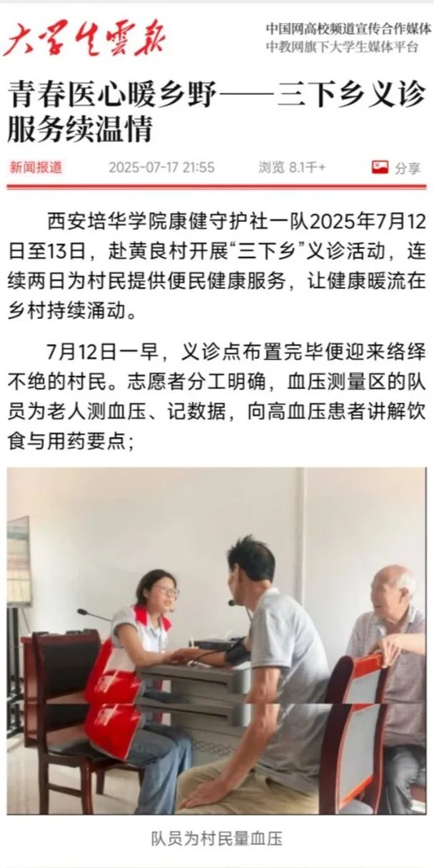青歌志愿服务队秉持“青春行万里,青歌进万家”口号,投身三秦学子“三下乡”实践。7月7日起扎根渭南故市镇,发挥医学专长,开展义诊、覆盖社区、养老院、乡村等地(服务超400人次 ),推进分科室深度见习,让检验、护理实操落地;电话随访700名慢性病患者,科普知识并发放200份健康手册。同步挖掘艾草中医药文化,融入农事助农、文化场馆参观。实践收获实践证明17封、感谢信23封,超500篇媒体报道,渭南日报、爱临渭,临渭融媒等当地主流媒体多次聚焦,以医学担当赋能乡村健康与文化振兴,用青春书写医学生实践华章。