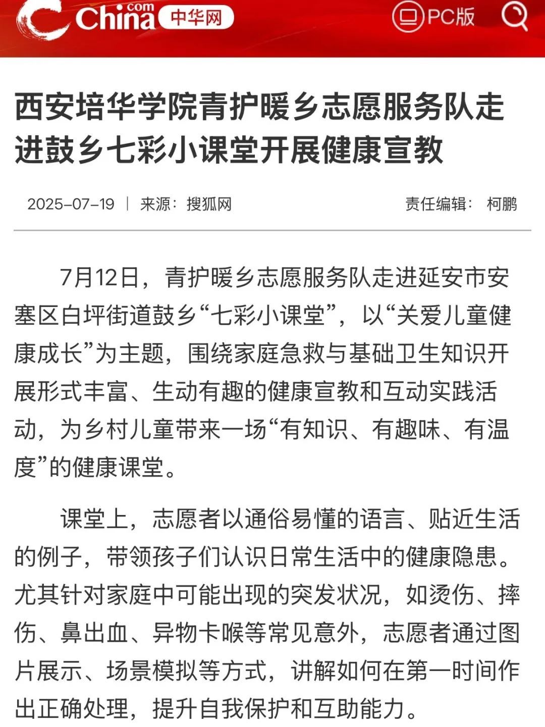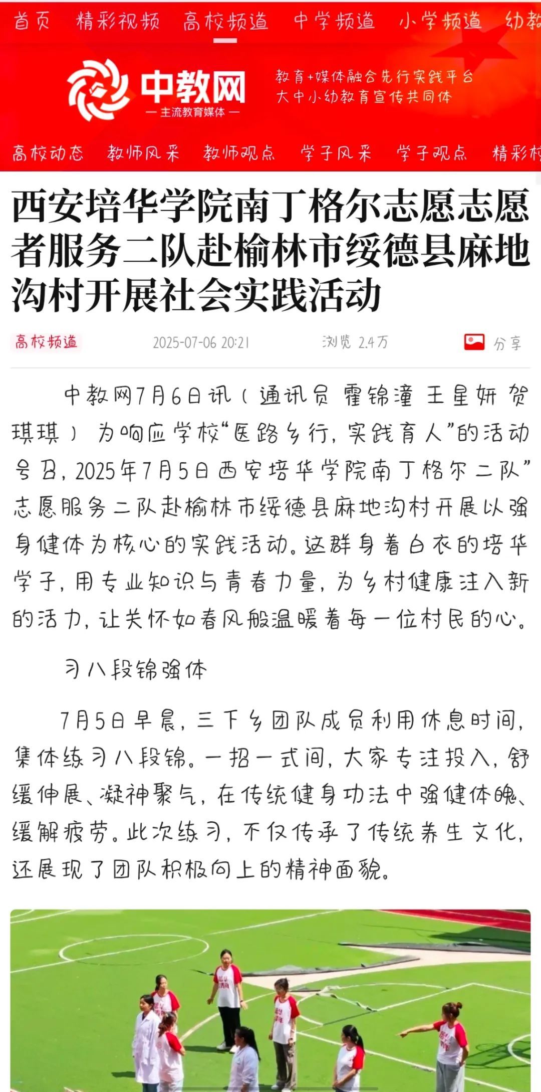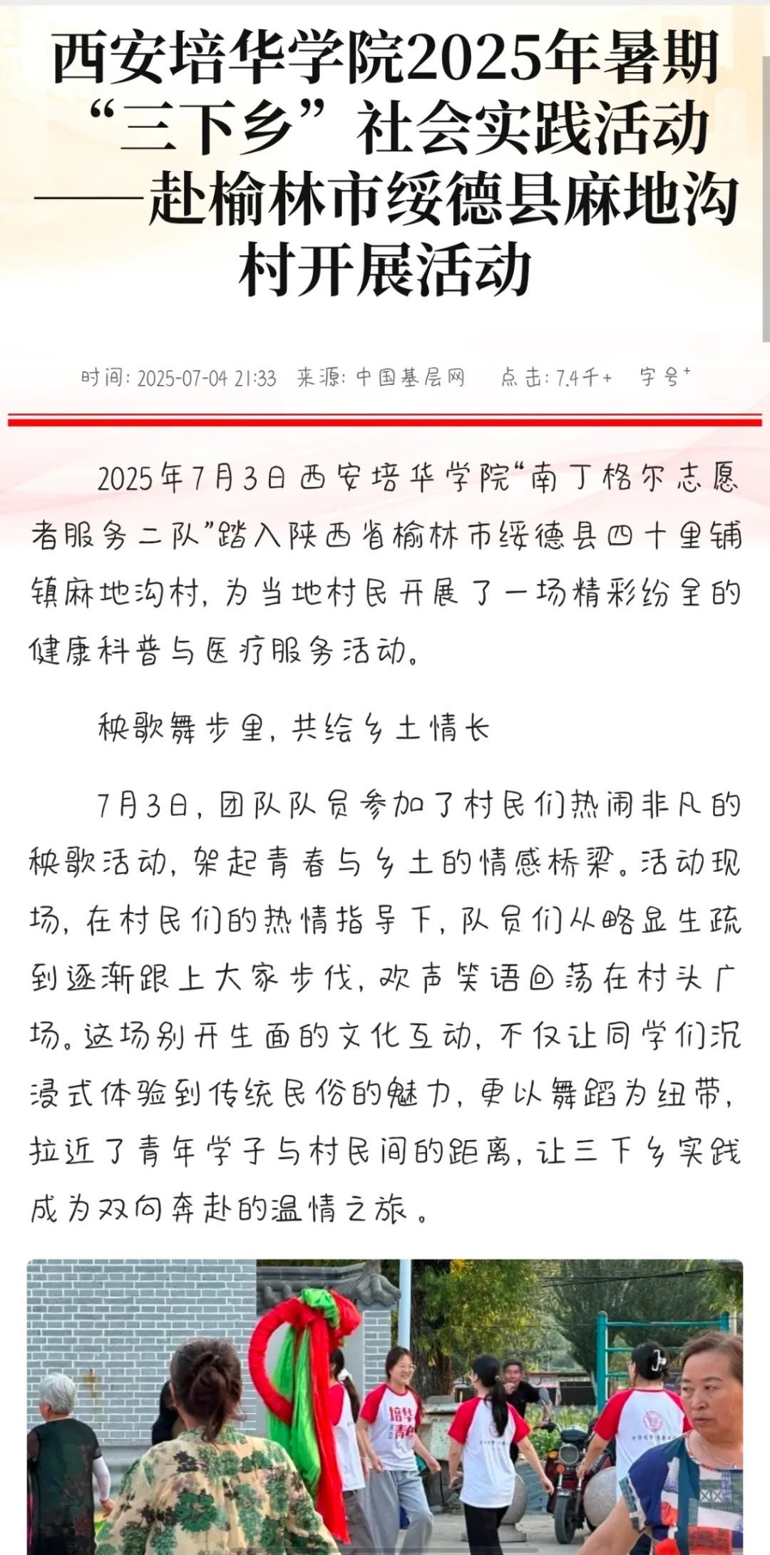 青护暖乡志愿服务队围绕“医心护健康,情暖乡村行”主题,深入陕西省延安市安塞区白坪街道,开展为期15天的2025暑期“三下乡”社会实践活动。团队通过健康义诊、中医理疗、卫生宣教、红色研学、关爱空巢老人和儿童陪伴等多种形式,服务群众超1000人次,切实将健康知识送入千家万户。活动期间,团队累计获得媒体报道300余次,其中国家级媒体20篇、省级媒体33篇、其他媒体247篇。实践过程中,团队共收到来自区团委、街道办、居委会、社工部、鼓乡爱心协会的5封社会实践证明及4封表扬信,充分展现了培华青年在新时代背景下服务社会、奉献基层的青春担当与责任使命。