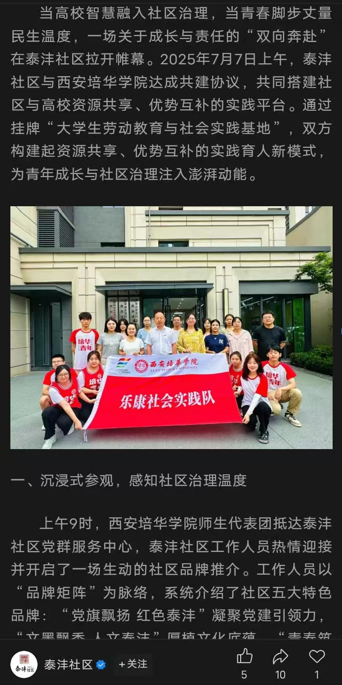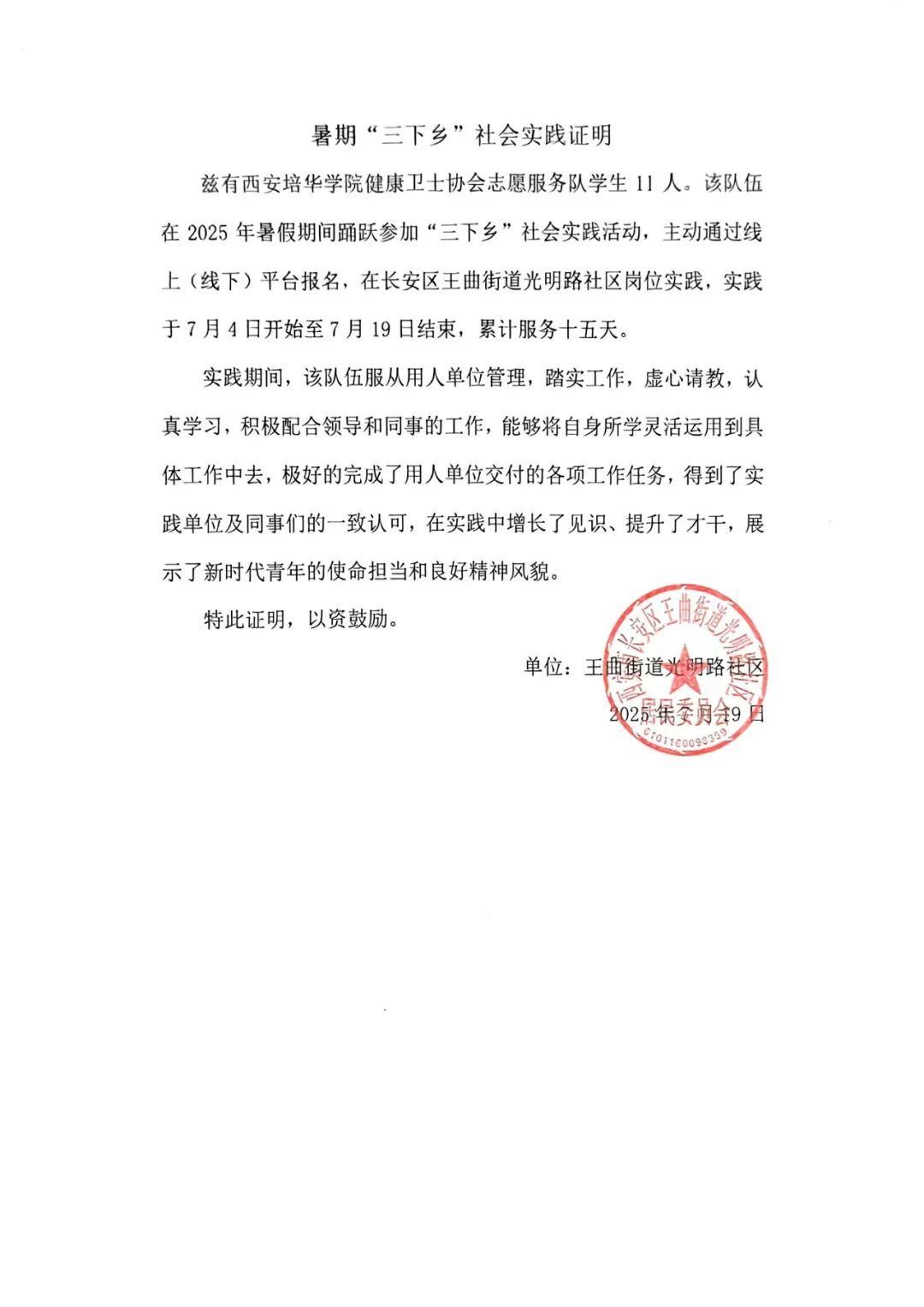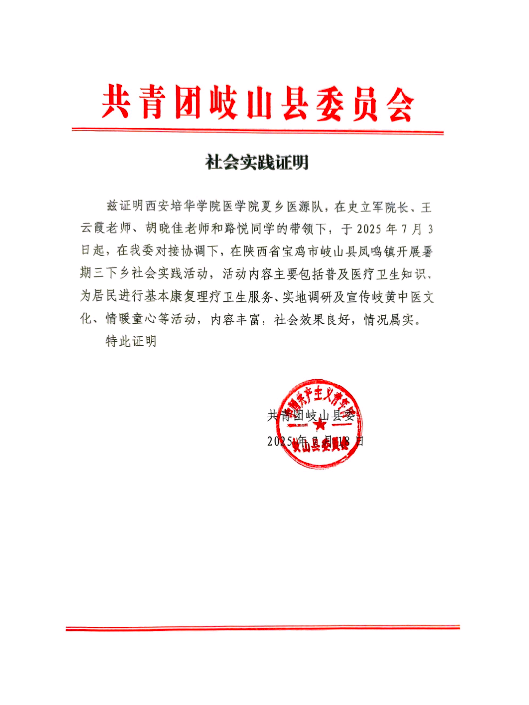 青护暖乡志愿服务队围绕“医心护健康,情暖乡村行”主题,深入陕西省延安市安塞区白坪街道,开展为期15天的2025暑期“三下乡”社会实践活动。团队通过健康义诊、中医理疗、卫生宣教、红色研学、关爱空巢老人和儿童陪伴等多种形式,服务群众超1000人次,切实将健康知识送入千家万户。活动期间,团队累计获得媒体报道300余次,其中国家级媒体20篇、省级媒体33篇、其他媒体247篇。实践过程中,团队共收到来自区团委、街道办、居委会、社工部、鼓乡爱心协会的5封社会实践证明及4封表扬信,充分展现了培华青年在新时代背景下服务社会、奉献基层的青春担当与责任使命。
