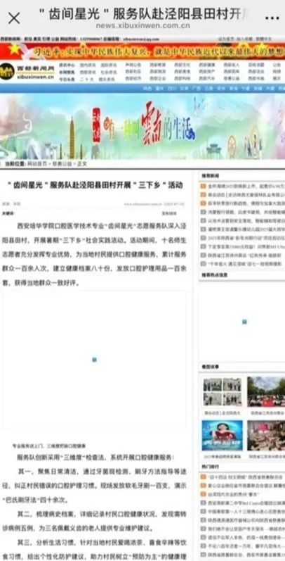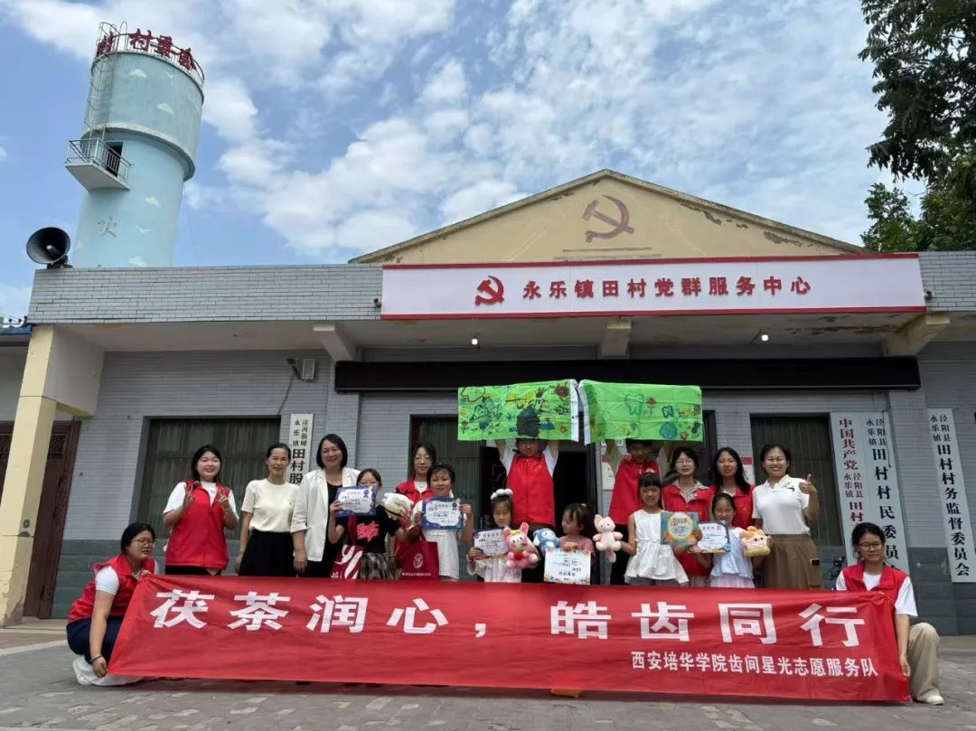 齿尖星光服务队以“茯茶润心,皓齿同行”为主题,在陕西省咸阳市泾阳县开展了为期14天的社会实践服务活动。在泾阳县多地举办口腔健康公益活动,普及护牙知识;走进茯茶镇,结合茶文化调研进行健康科普;探访茯茶非遗场馆,感受文化魅力;还走进安吴青年训练班纪念馆,传承红色精神。通过此次实践活动,齿星光服务队累积服务时间过百小时,获得当地调查问卷150份,为当地留守儿童发放关爱礼包20份。截至目前团队获得到今日头条、百度新闻、西部新闻网、多彩青年网等国家级媒体报道15篇,省市级媒体报道6篇,校级媒体报道6篇。