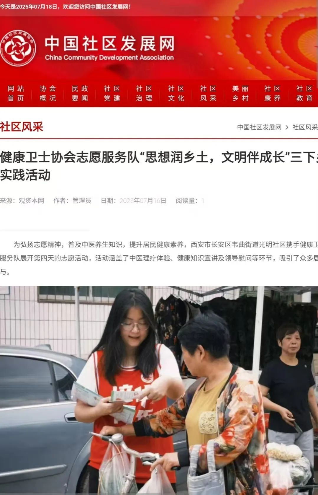 健康卫士协会志愿服务队共计11人在长安光明社区进行三下乡活动,成果斐然,以多元服务矩阵掀起健康热潮。义诊现场,刮痧、拔罐、艾灸等中医技法精准惠民,累计服务人数超200余人;健康宣讲直击夏季需求,中医智慧与防暑妙招双管齐下,成员累计开展8场知识宣讲,向居民发放健康知识宣传册200份;幼儿园互动中,志愿者以趣味游戏为载体,将防暑知识、合理饮食等理念种进孩子心田,并奖励文具用品数240件。活动期间,队员充分利用自身所学,让服务初心更添厚度。这份专业与温度收获了居民感谢信与社区实践证明共计15篇,累计投稿452篇、其中300余篇刊发文章,让活动影响力持续扩散,成为三下乡服务的标杆范例。