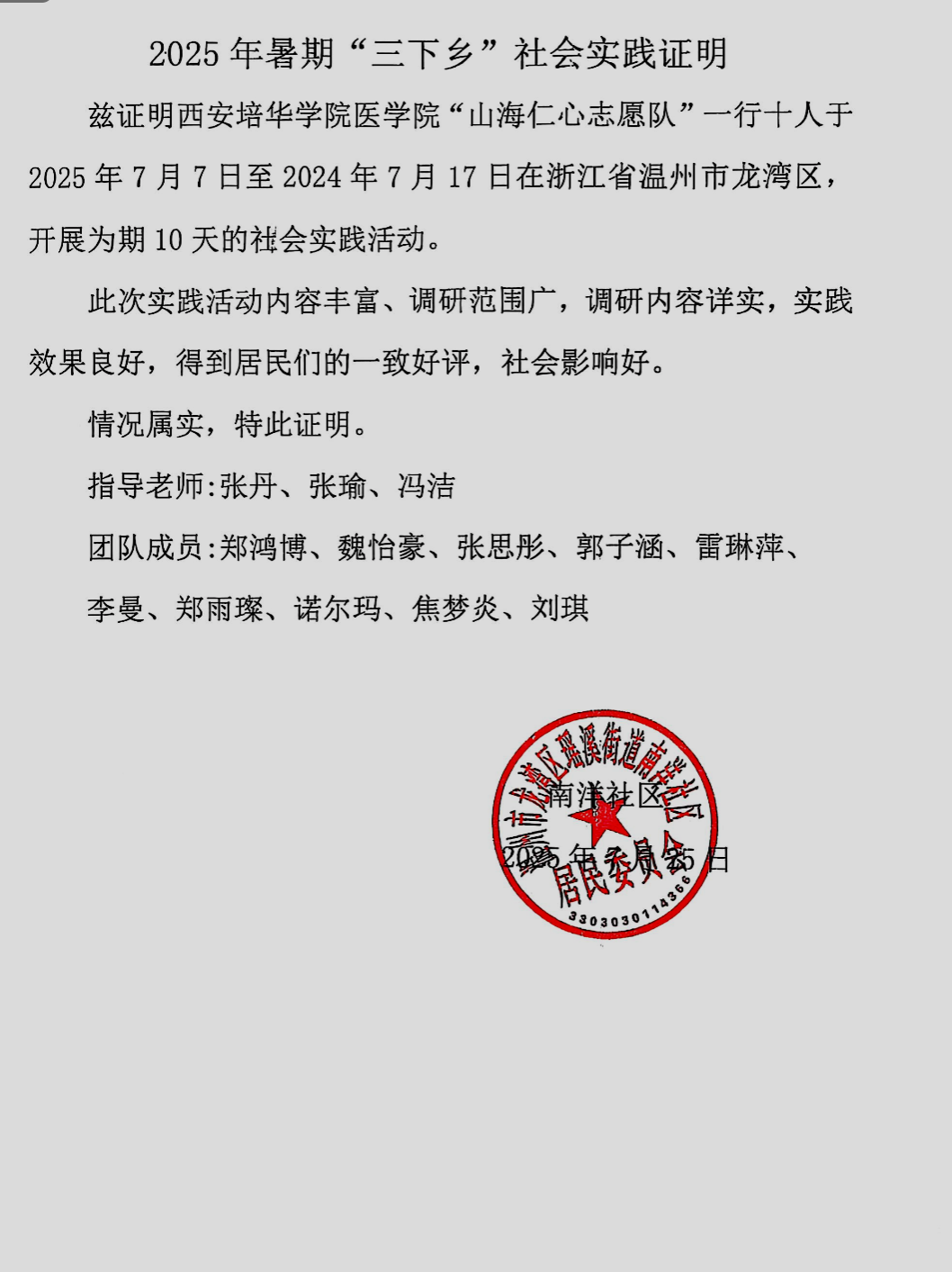 山海仁心志愿队于浙江省温州市龙湾区南洋社区开展为期10天的三下乡社会实践。实践队携手温医大附二院深入社区提供多元服务:协助开展义诊活动,累计服务群众200余人次,进行健康检查;参与儿童陪伴活动,通过趣味互动传递关爱;助力组织健康知识讲座,提升居民健康素养。同时团队积极开展普通话使用情况问卷调查,了解社情民意。队员们以专业热忱助力社区健康建设,展现青年担当。实践活动获得广泛关注,团队累计投稿各级自媒体报道622篇,其中国家级179篇、省级192篇、市级171篇、区县级79篇、校级1篇,截至目前共得到中国医疗行情报、温度新闻、九三学社温州市委员会、阅龙湾等媒体专题报道。