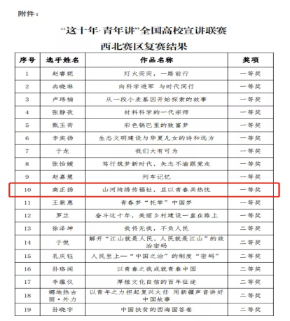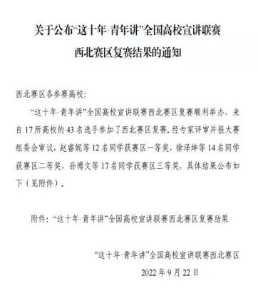 3、2022年7-9月,在教育部思想政治工作司指导下,“这十年·青年讲”全国高校宣讲联赛于6月份正式打响。来自西北赛区17所高校的43名选手参加西北赛区复赛,经过视频录制、选拔申报、线上评议等环节,西安培华学院云梯青年宣讲团选送的作品《山河绮秀传福祉,且以青春共热忱》(宣讲人:高正扬 人文与国际教育学院汉语言文学2108团支部)获得西北赛区一等奖;作品《画好同心圆,共筑中国梦》(宣讲人:员泽阳 人文与国际教育学院汉语言文学2004团支部)和《从特困村到广惠园》(宣讲人:辛亚杰 传媒学院播音与主持艺术2003团支部)荣获西北赛区三等奖。