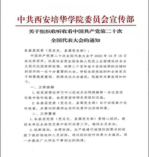 1、2022年10月16日中国共产党第二十次全国代表大会在北京召开,共青团西安培华学院委员会发布《关于组织收听收看中国共产党第二十次全国代表大会的通知》积极组织各级团组织观看学习热议二十大。在恒友楼四楼报告厅设主会场,各二级学院团委设8个分会场,按照常态化疫情防控要求,线上线下相结合,共同收听收看党的二十大开幕盛况。