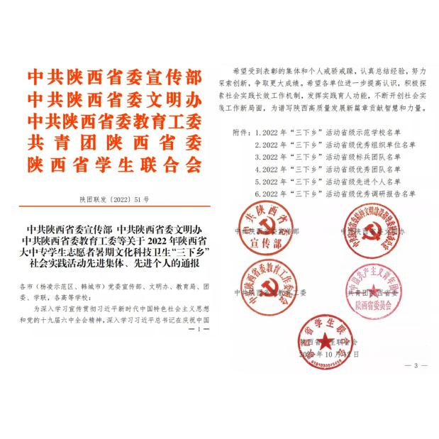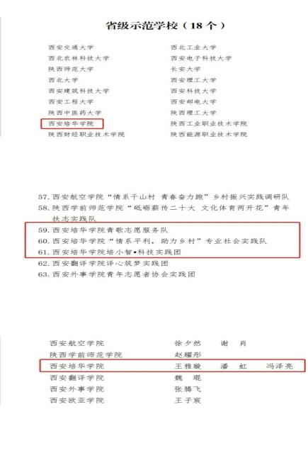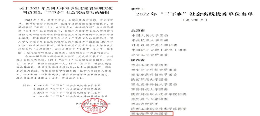 1、为进一步深化实践育人效果,我校团委积极开展三下乡资料收集整理、活动审核、资料评审等工作并积极上报。2022年我校三下乡工作成果斐然,在国家级荣誉中,我校荣获“2022年全国大中专学生志愿者暑期‘三下乡’社会实践活动优秀单位”称号;在团中央专项中,西安培华学院青歌志愿者服务队、探访四知奥秘巾帼服务队、微光志愿服务队,从4000多支队伍中脱颖而出,获批2022年“七彩假期”志愿服务示范团队;在省级荣誉在,我校荣获2022年陕西省大中专学生志愿者暑期文化科技卫生“三下乡”社会实践活动“省级示范学校”荣誉称号;西安培华学院青歌志愿服务队(医学院)、西安培华学院“情系平利,助力乡村”专业社会实践队(传媒学院)、西安培华学院培小智•科技实践团(智能科学与信息工程学院)荣获“省级优秀团队”荣誉称号;三下乡社会实践指导教师代表王雅璇(传媒学院团委书记)、星火计划青春实践团负责人潘虹同学(会计与金融学院会计学1901团支部)、大秦曙光筑梦队负责人冯泽亮同学(体育学院体育教育2001团支部)获得“省级先进个人”荣誉称号;