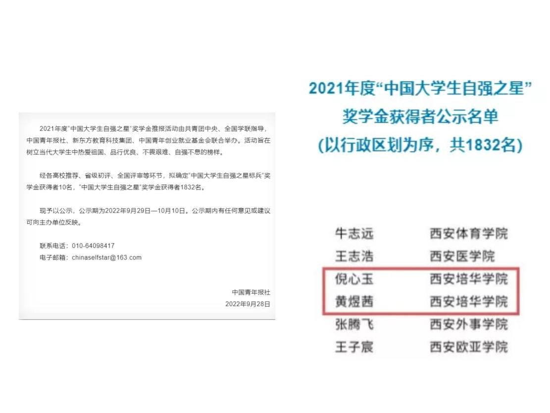 4、由共青团中央、全国学联主办的2021年度“中国大学生自强之星”评选结果揭晓,我校倪心玉同学(传媒学院)和黄煜茜同学(人文与国际教育学院)荣获“中国大学生自强之星”荣誉称号。同时,在陕西省组织开展的2021年度“陕西省大学生自强之星”推报活动中,倪心玉、黄煜茜同学也双双荣获“陕西省大学生自强之星标兵”荣誉称号。