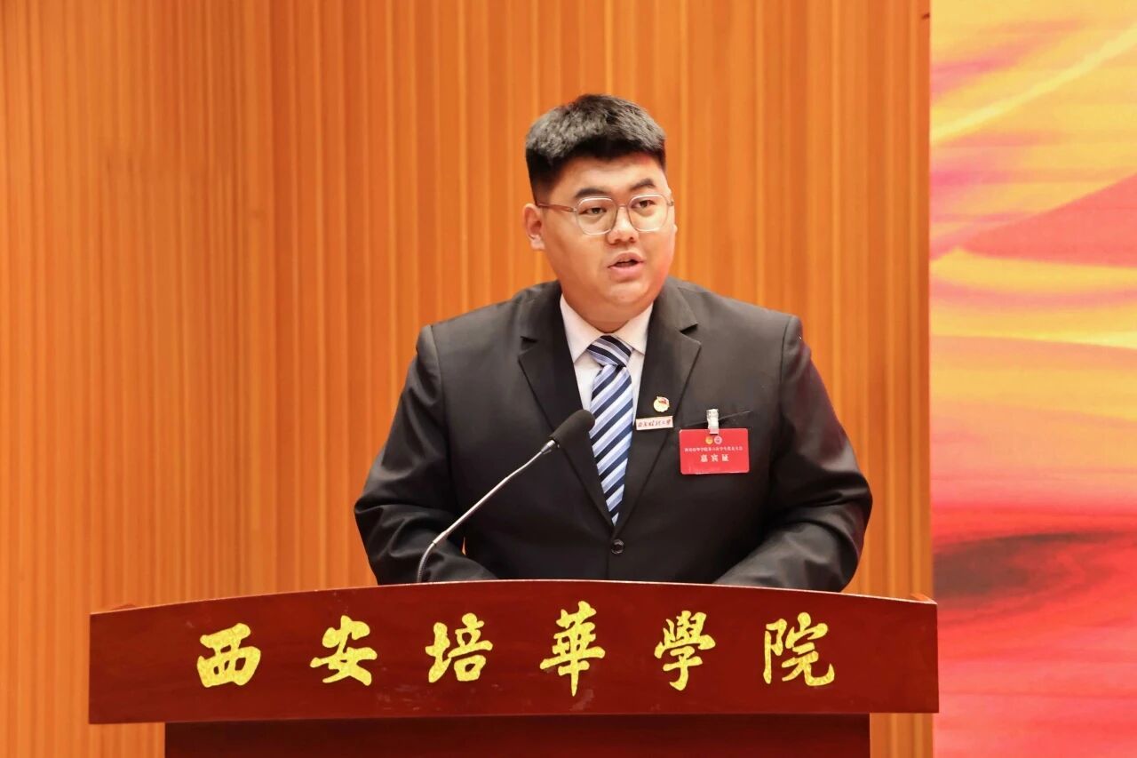 西安财经大学学生会执行主席王志杰致辞,他希望西安培华学院学生会以此次大会为起点,团结广大同学,携手各兄弟高校学生会组织,在实现中华民族伟大复兴的壮丽征程中,胸怀壮志、勇担使命,以青春之激情、青春之智慧、青春之力量,谱写属于青年一代的壮美赞歌。