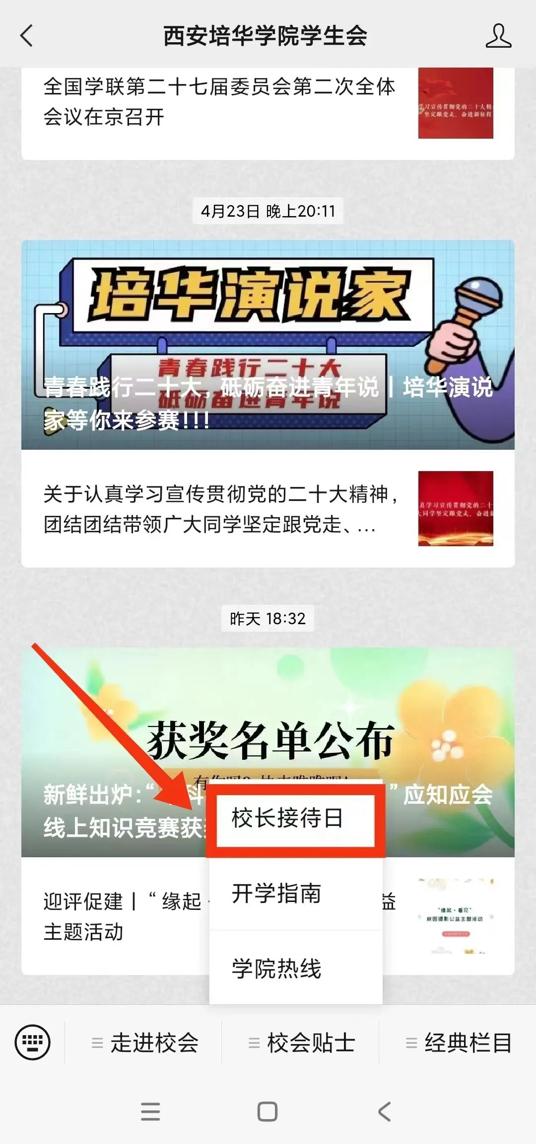 2、关注“西安培华学院学生会”公众号,在公众号“校会贴士”栏目处,点击校长接待日进行填表报名。