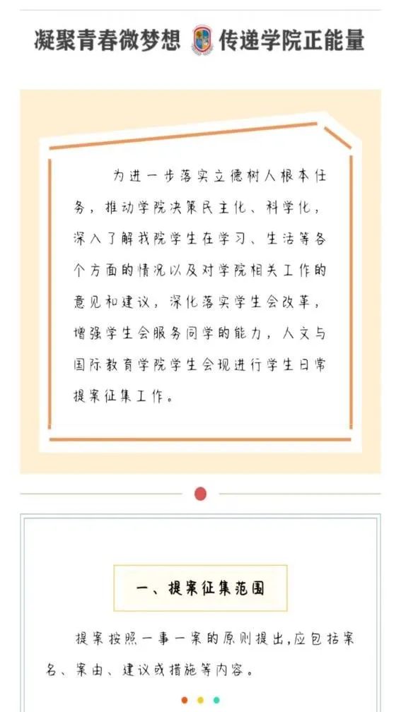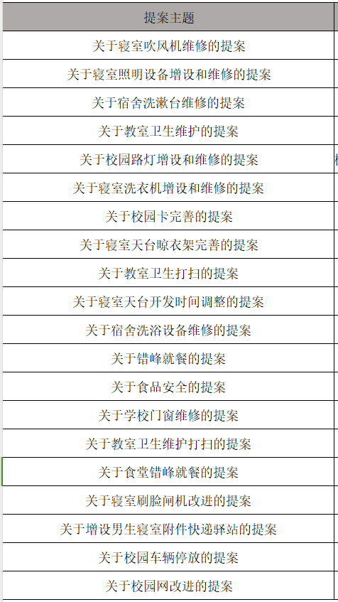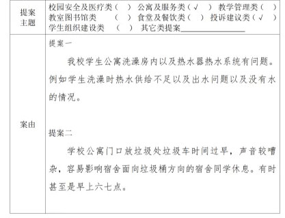 自提案投稿征集信息发布以来,我院学生会组织接收同学们的权益提案共计40份,整理归纳上报20份,已解决提案20份。其中,公寓及服务类9份,投诉建议类5份,食堂及餐饮类3份,教室图书馆类2份,校园安全及医疗类1份。