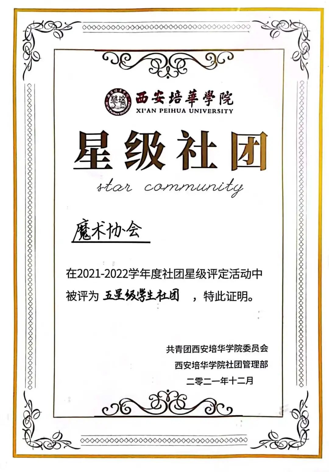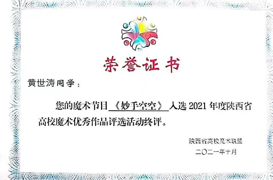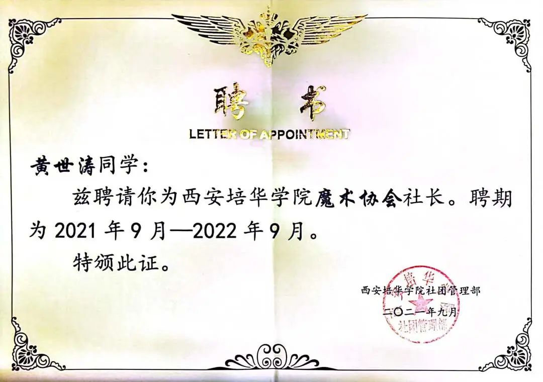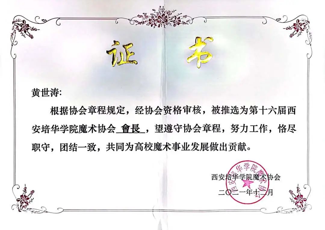 3.2021年9月被受聘为西安培华学院魔术协会会长