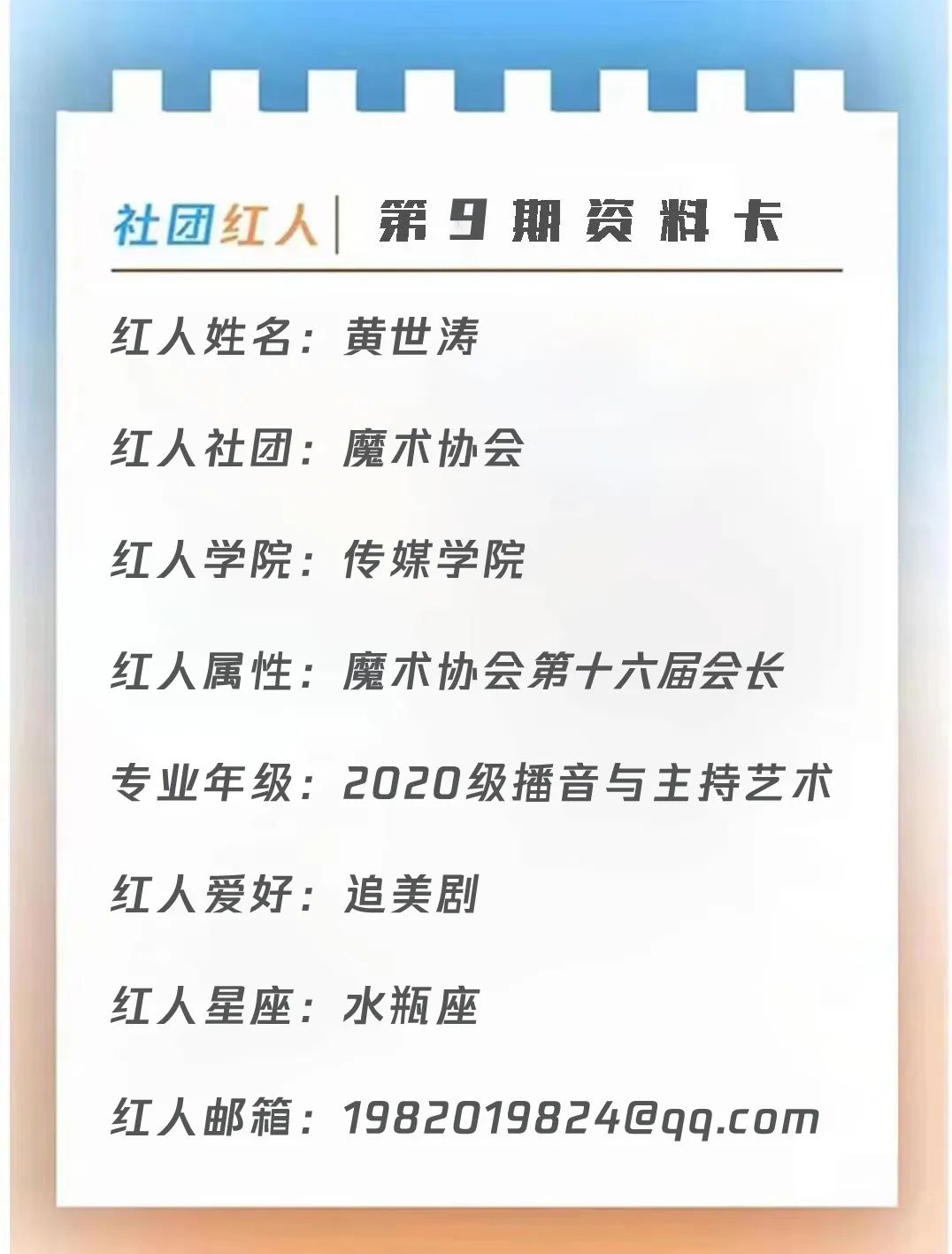 ,在他的带领下魔术协会又创新高。同时他也是一位关心他人,照顾他人的会长,能及时发现我们学习魔术中不懂的地方并详细教学直到你学会了为止。