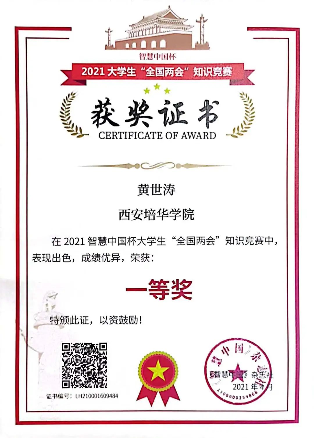 智慧中国杯大学生“全国两会”知识竞赛荣获一等奖
