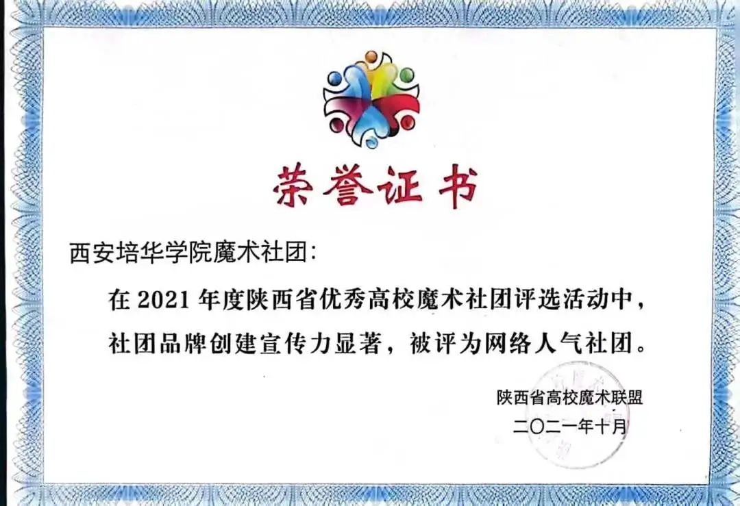 参与突破十万人。社团荣获国家部委奖项2项,省级奖项42个,多次被陕西省杂技艺术家协会评为“陕西省优秀高校魔术社团”。2021年被中国青年报评选为“2020全国百强社团”!