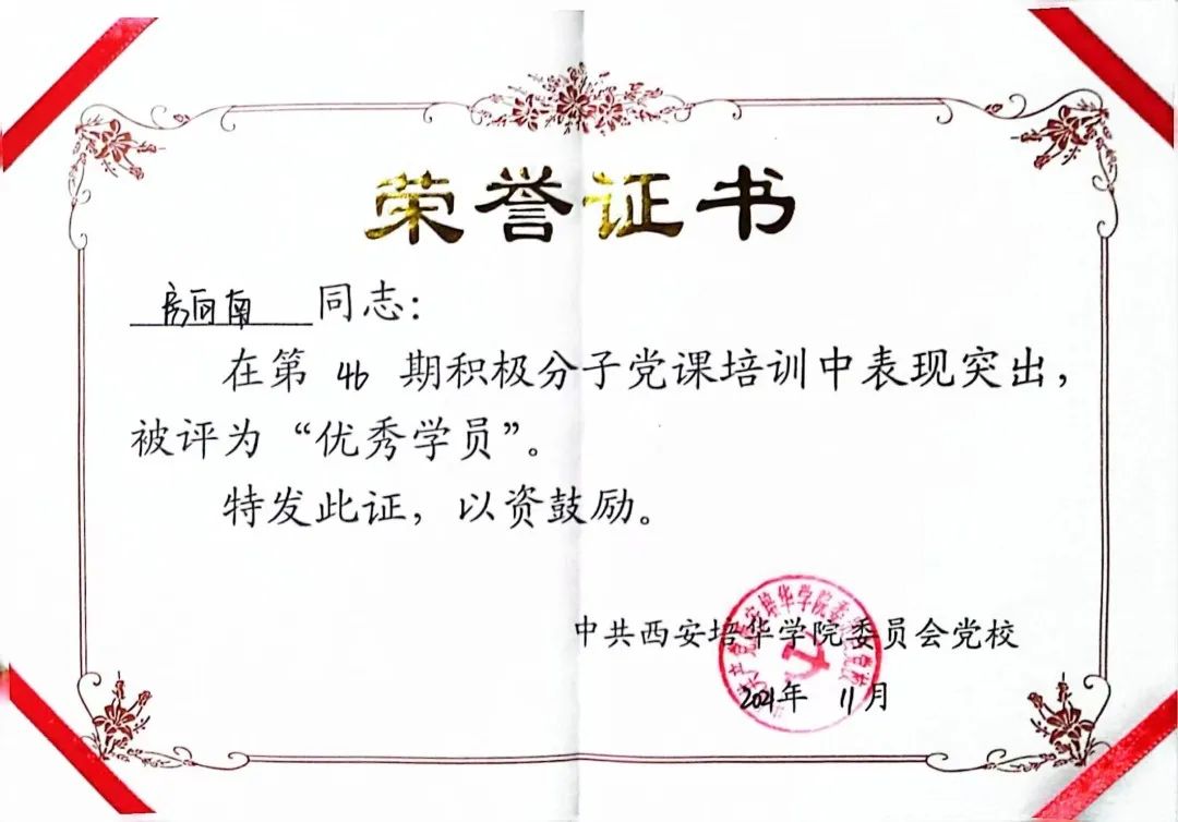 2021年11月获西安培华学院第46期积极分子“优秀学员奖”。