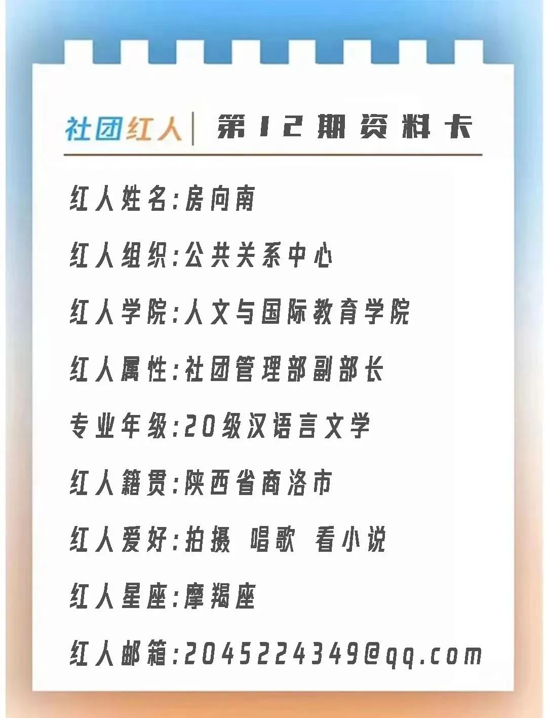 A1.进入社管这个大家庭其实真的很奇妙,当时初入大学的我在其他朋友的推荐中来到了社管纳新的帐篷,看到学长学姐们向学弟学妹的热情介绍社管的有趣之处以及他们身上散发出的自信阳光的魅力,便被他们深深的吸引,从而来到了社管这个大家庭。