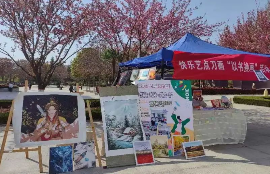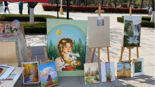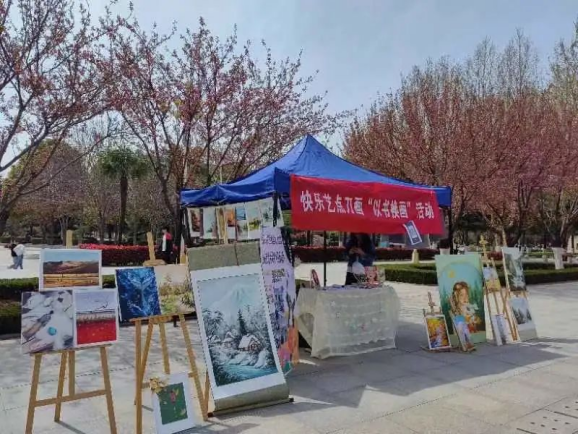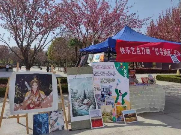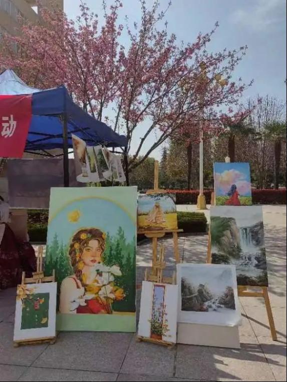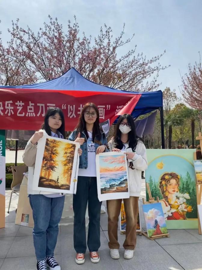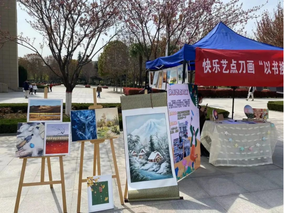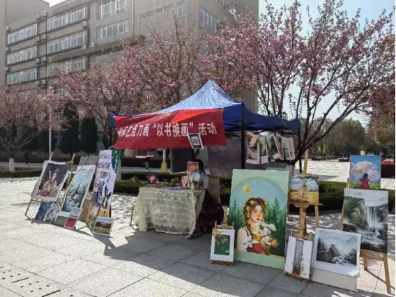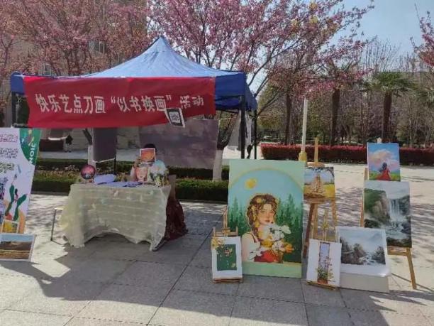 为了带大家感受文化的气息,感受文化的魅力,快乐艺点刀画社团于3月29日—3月30日在综合楼西广场举办了“以物换画”活动,用一件有意义的东西即可在展位区盲盒抽选一幅手绘油画作品及一次试画机会。本次展出的作品主要是刀笔油画,其中山水作品偏多,笔法细腻,风景活灵活现,以缤纷的色彩让大家在丝丝凉意中,感受到温暖。