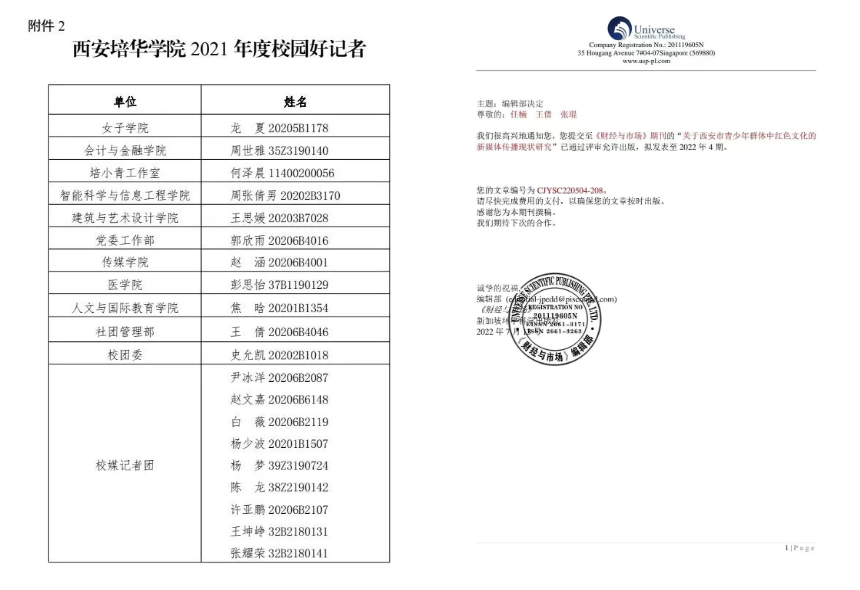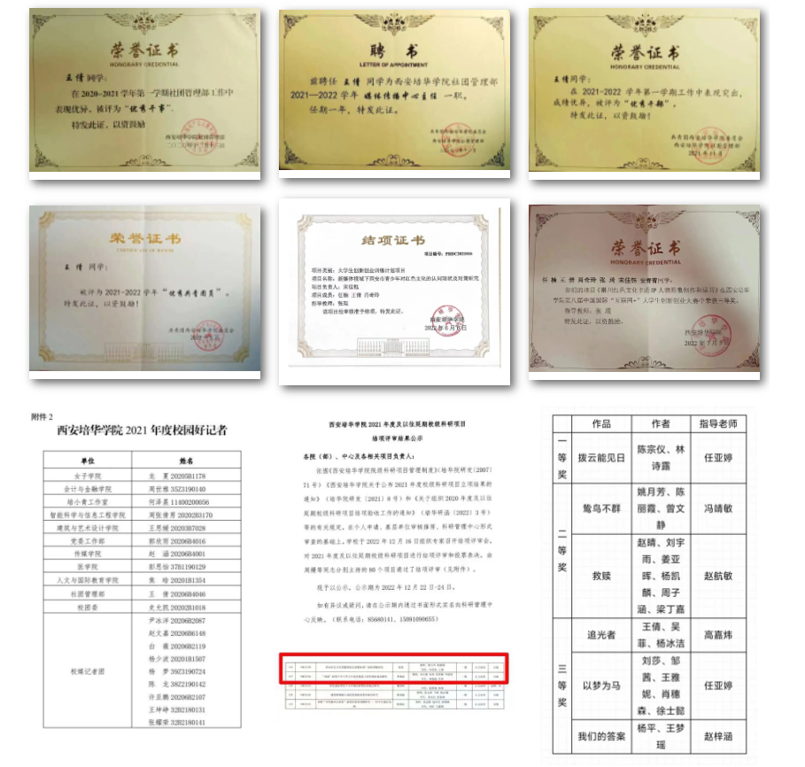 2021.10获得“西安培华学院2021年度校园好记者”荣誉称号;
