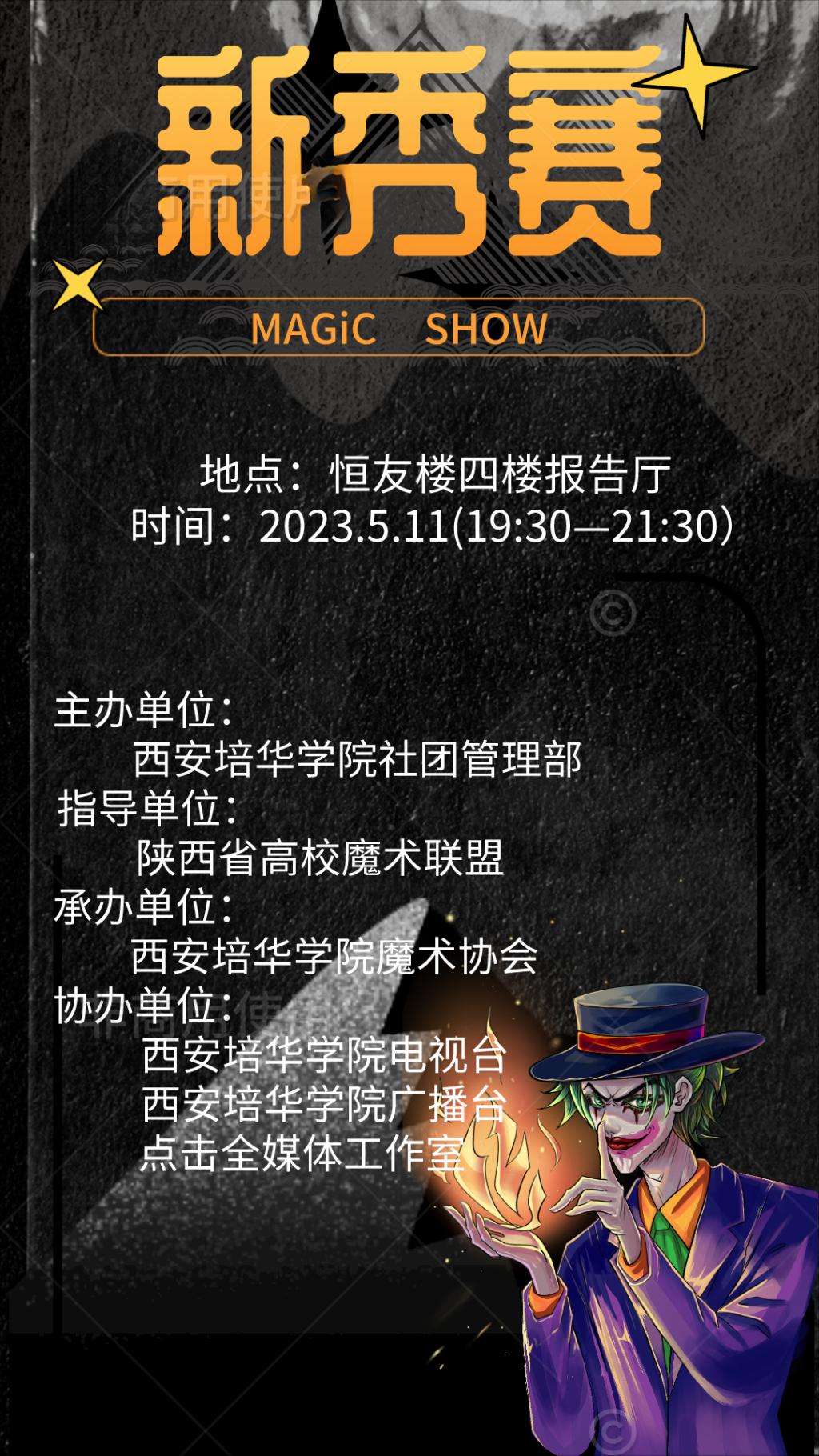 为了检验西安培华学院魔术协会第十七届会员的学习成果,由西安培华学院社团管理部主办、陕西省高校魔术联盟指导、西安培华学院魔术协会承办、西安培华学院电视台、西安培华学院广播台、点击全媒体工作室协办的西安培华学院魔术协会第四届校园魔术新秀赛于本周四召开。