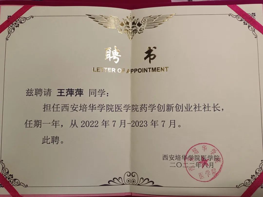 2022年6月获得药学创新创业社长聘书