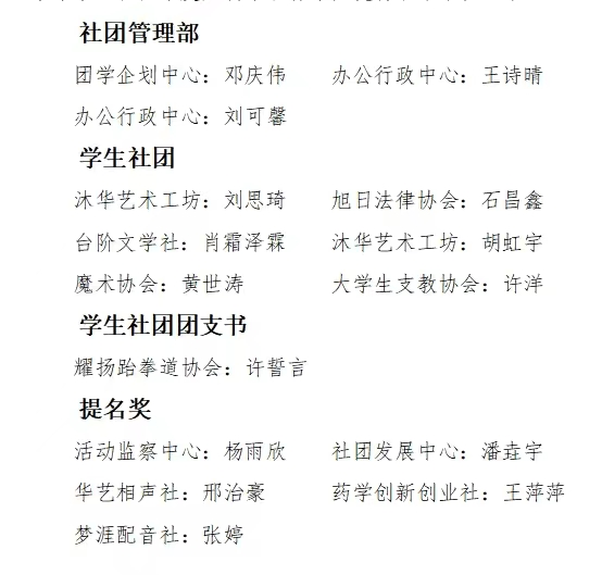 本着公开、公平、公正的原则,经过各部门推荐,高度重视、认真评选后由领导审核,向以下同学授予2022-2023学年学生社团年度人物荣誉称号,现将名单予以公示: