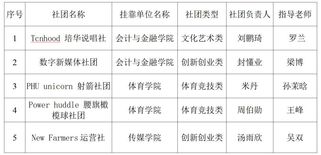 为进一步规范我校各类社团建设管理,促进学生社团健康发展,稳步推进学生社团改革,根据《关于印发西安培华学院学生社团管理条例(试行)的通知》(培华团发[2021]4号)文件的相关要求,由负责人先行申请,通过具体材料审核、成立答辩、评委提问等各个环节,经校团委评议后,确定予以下社团进行成立注册,具体名单如下: