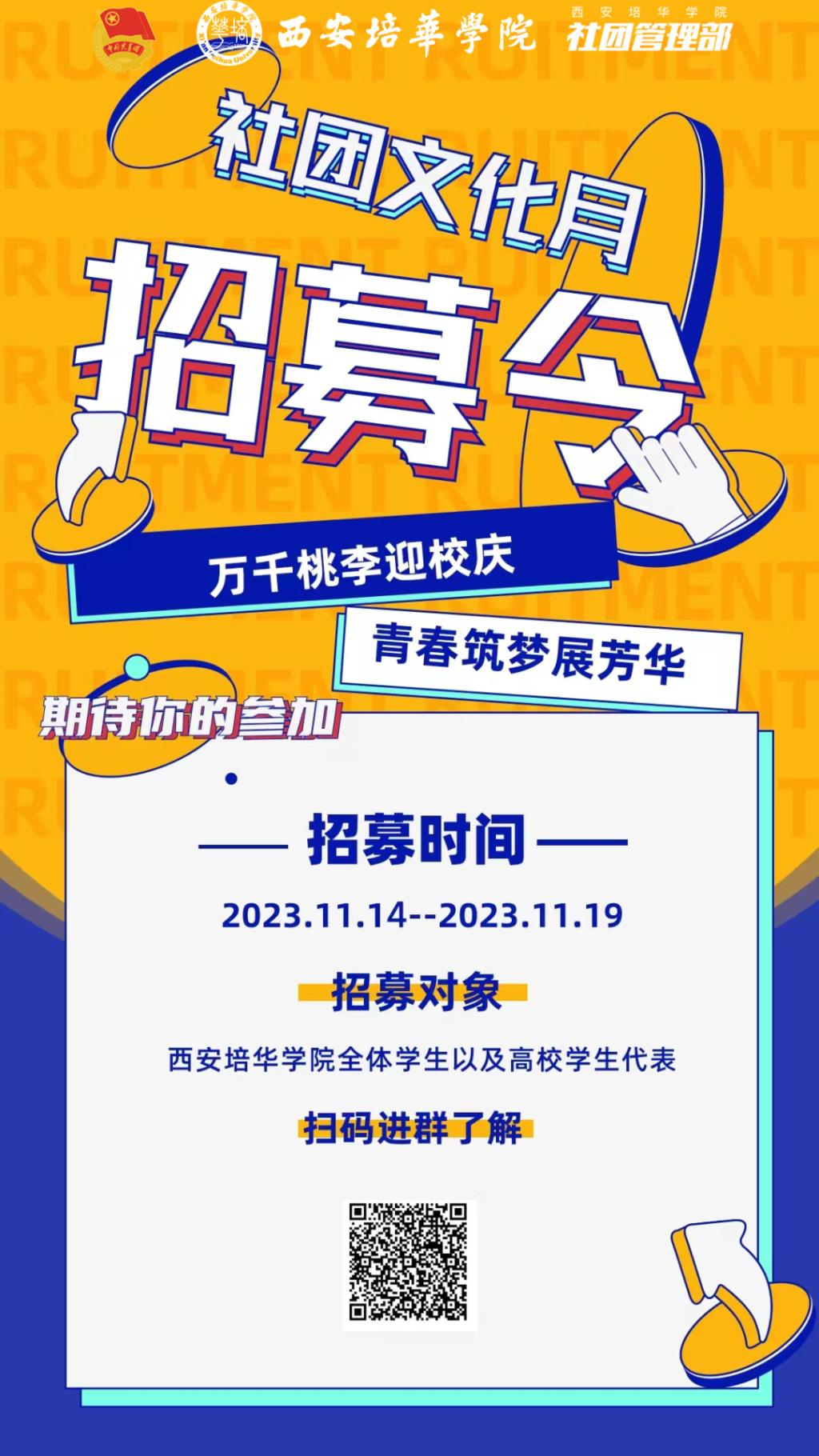 为了庆祝培华九十五周年校庆,西安培华学院社团管理部以及各社团组织将联合举办一年一度的“社团文化月”。为了展现出社团特色,打造精品社团,加强社团与社联及全校师生的联系。突出“万千桃李迎校庆,青春筑梦展芳华”的主题,向全校师生及外界人士展现我校优秀的社团发展成果,提高我校社团的知名度和影响力,繁荣校园文化。将由社团管理部联合各大社团举办这次的社团文化月闭幕式晚会,欢迎全体学生及各高校学生代表踊跃报名,积极展现精彩的自己。