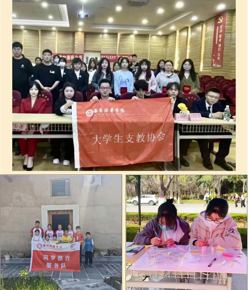 西安培华学院大学生支教协会创建于2003年11月22日,以“爱心支教”为主的学生自发组织的非盈利性的公益社团。社团分为志愿服务部、外宣联络部、文娱策划部,各部门之间通力合作,团结一心,致力于让更多的人,怀感恩之心,走进支教,走进公益。几十年来,社团积极参与社会公益服务活动,奉献爱心。协会的工作具有志愿性、无偿性、公益性、组织性,在大学生中开展支教工作,具有良好的人力基础,高涨的服务热情。