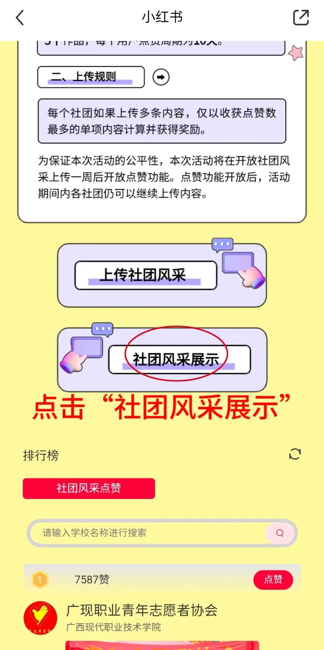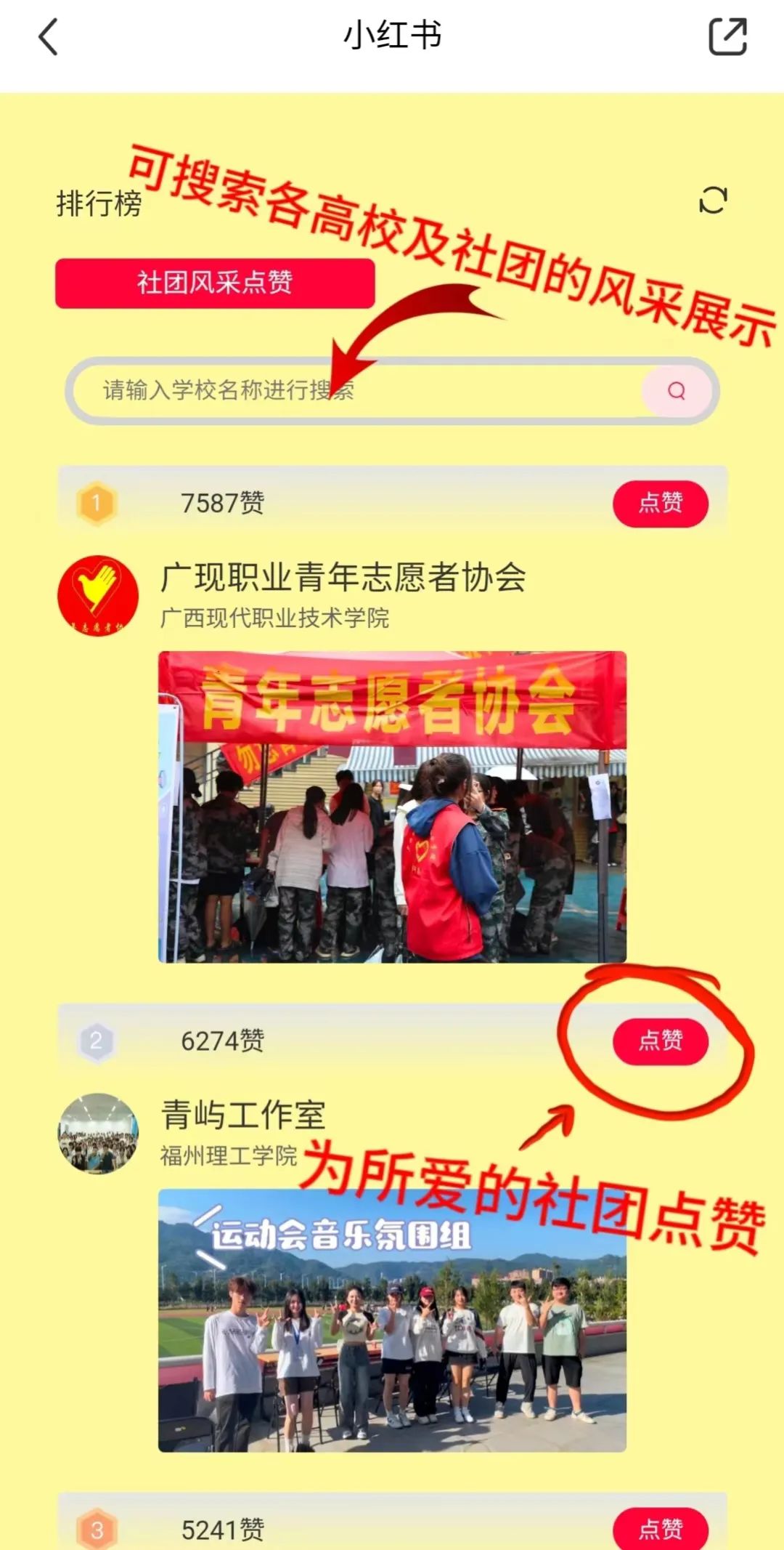 在活动页面点击“社团风采展示”,可以查看全国所有参与活动社团的图文风采;在活动页面的“排行榜”位置,可以浏览和搜索各高校及所属社团的风采展示,并为喜欢的社团点赞支持
