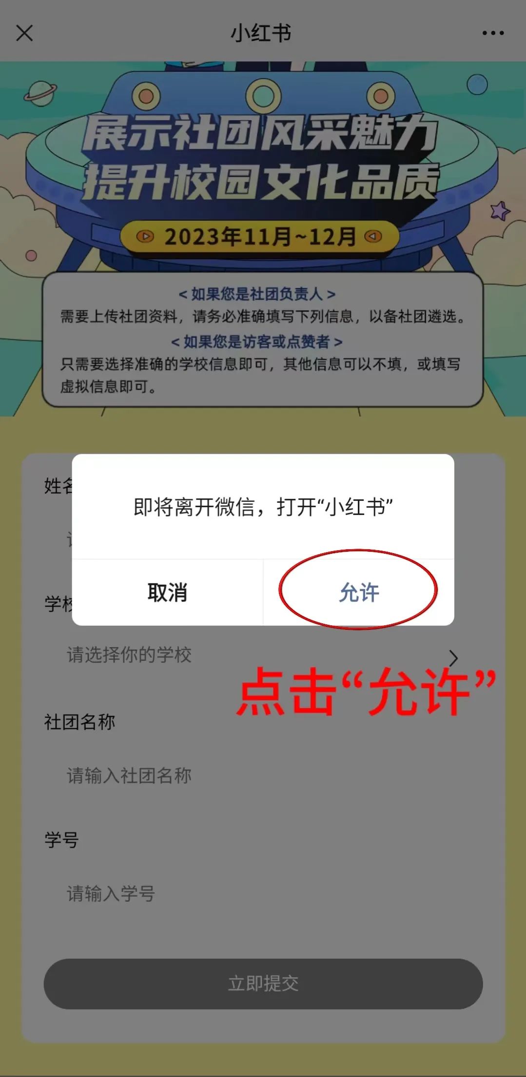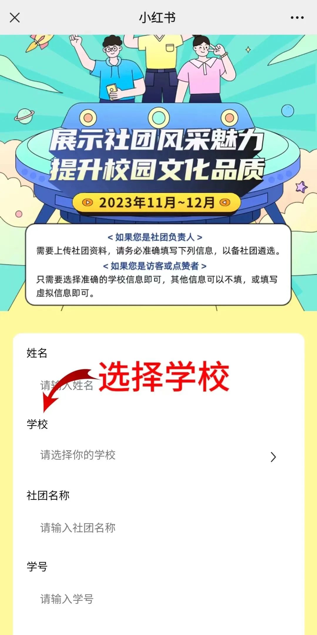 通过微信扫描活动二维码(同上述二维码),识别后跳转到小红书的报名页面。在页面仅需选择“学校”一项,即可进入活动页面