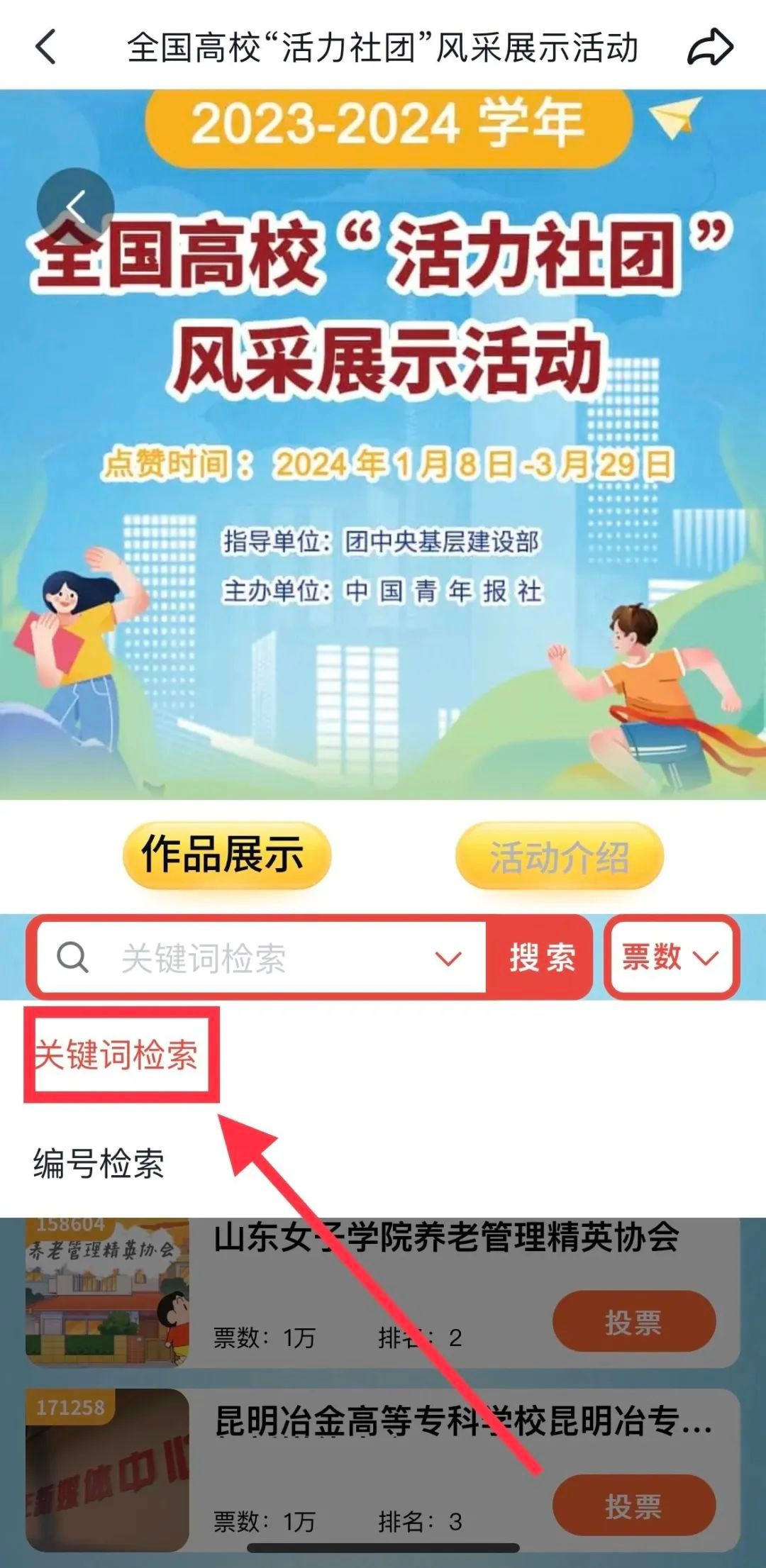 进入活动界面后点击搜索框后的小箭头,展开选择关键词搜索,输入:西安培华学院,即可看到参赛视频内容,并进行投票