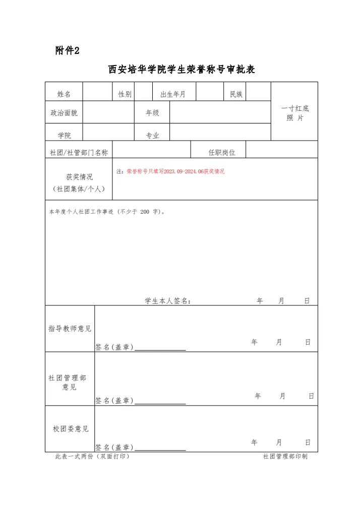 1.严谨细致,重视时效。社团年度人物的评选工作在2024年6月3日前完成,电子版审批表在5月29日前提交至社团管理部电子邮箱(002214@peihua.edu.cn)。评选结束后,需提交纸质版审批表(附件2)及相关佐证材料至社团管理部办公室。