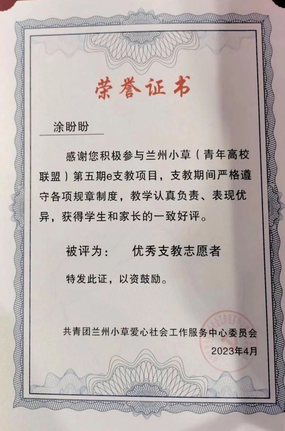 2023年4月兰州小草第五期支教项目被评为“优秀志愿者”