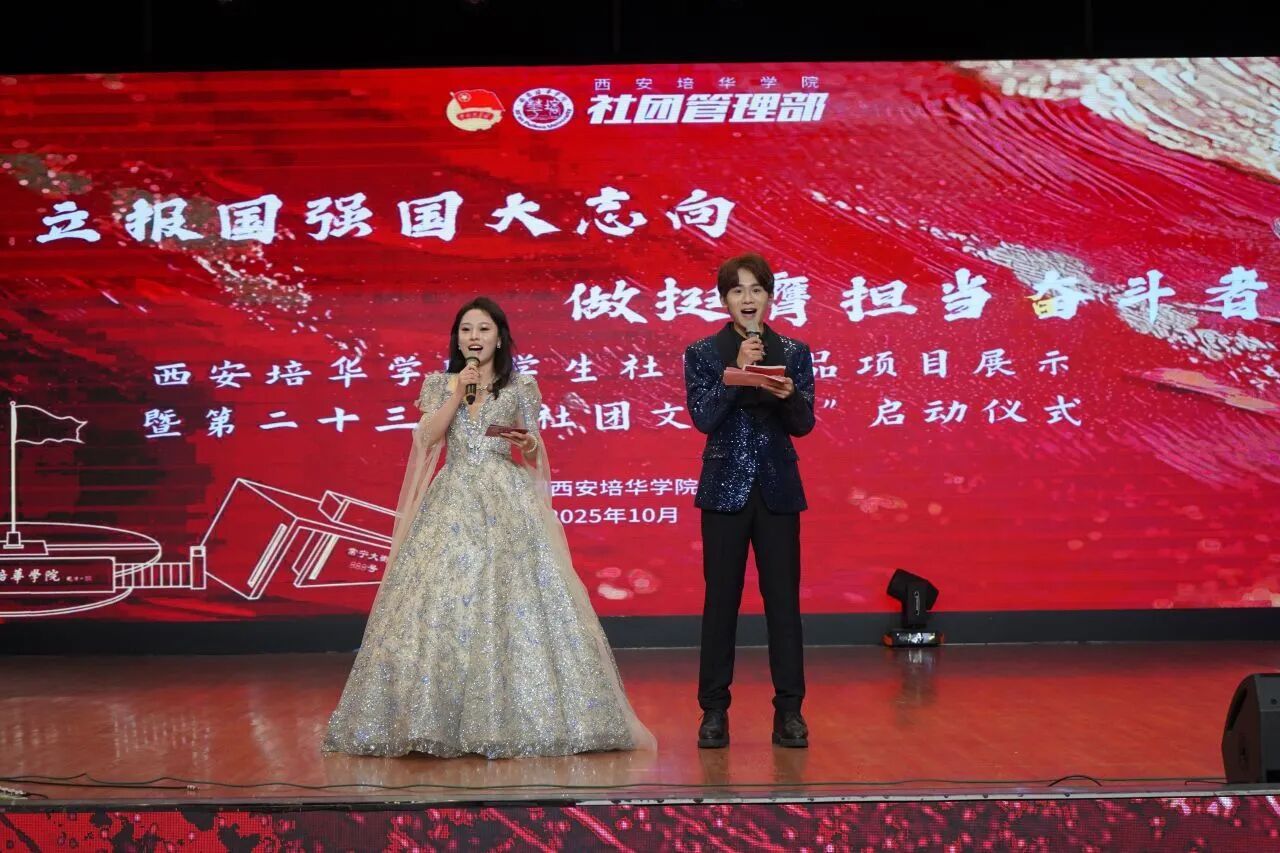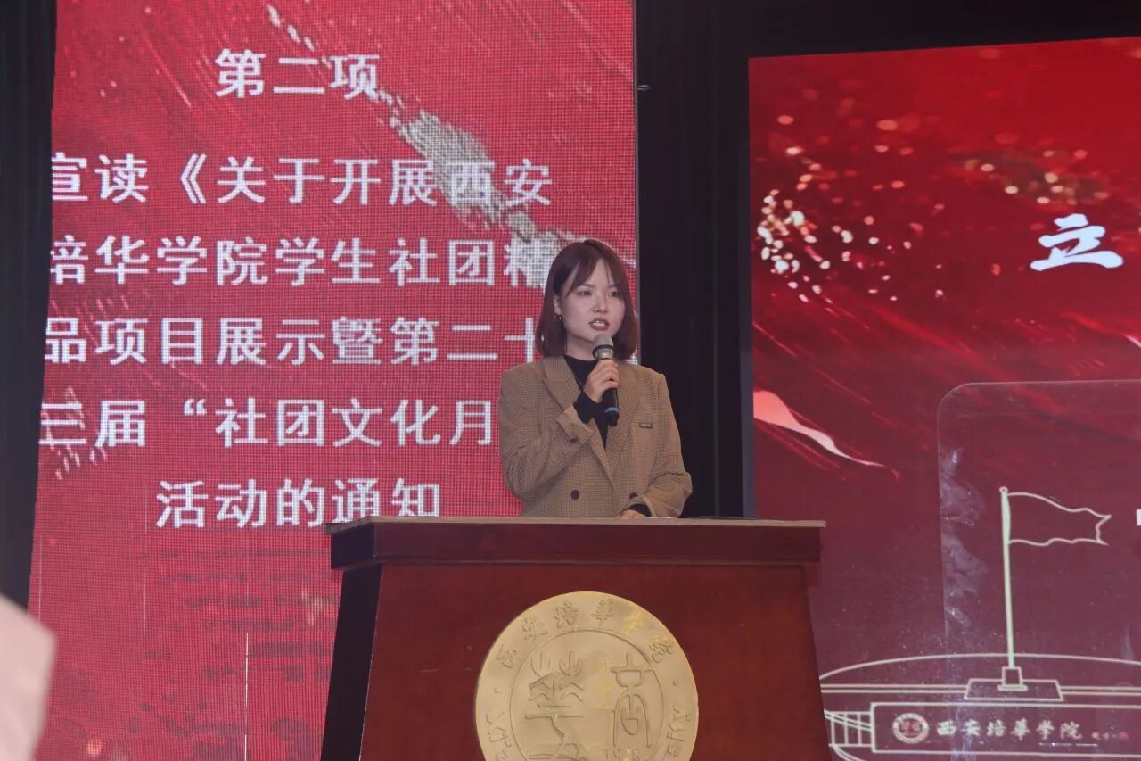 赵梦莹老师宣读《关于开展西安培华学院第二十三届“社团文化月”暨学生社团精品项目展示活动的通知》中呈现文化月蓝图、开启活力之旅,还提及将为优秀社团精品项目授荣誉、传期望,这些项目是学子践行“立报国强国大志向”“做挺膺担当奋斗者”的体现。