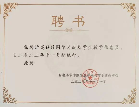 西安培华学院教学信息员聘书