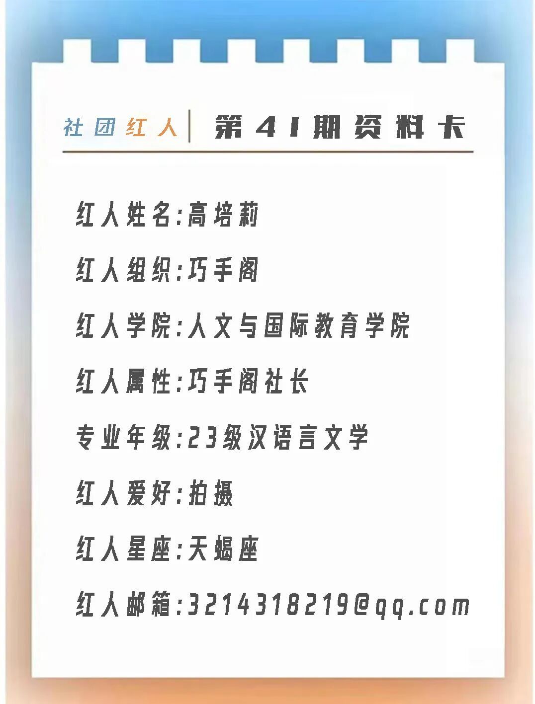 首先,很荣幸培莉让我写这个印象。怎么说呢,我所认识的培莉刚开始给人一种不太好相处的样子,总是很严肃,后面慢慢接触后发现原来是一个很宝藏的女孩子,她是我们班的学委,看起来小小的一个,却总是忙忙碌碌的为每位老师和每个同学服务,很有责任心,不管在生活还是学习上都很积极向上,并且我发现她也是个很细心的小女生,希望漂亮有趣的她,一直能开开心心,平平安安,永远明媚,永远做自己。相信她带着自己赤诚和社团都会越来越好!!!