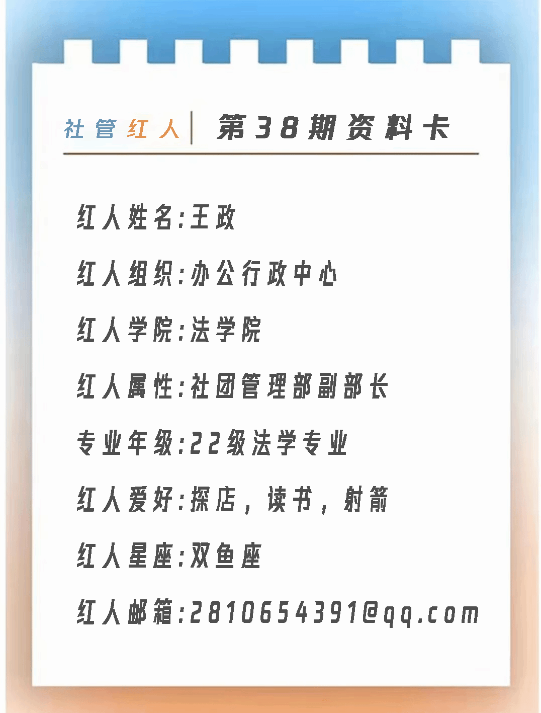 刚认识王政这位小伙的时候,他还是大一,那段时期活动还挺多的次次都能看到他的身影,当时感觉“这小伙”还挺e还挺喜欢社管的很热情!!后边随着慢慢的了解,发现他不仅热情还很负责,就像是社管大家庭中的家长,办活动有他在,稳稳的很放心。虽然大家现在都变得忙碌起来了,平时没有过多的时间见面,但是我相信社管有你们在一定可以发展的更好,希望你们在未来的这段时间里可以创造出属于你们自己的独家记忆,也希望你一切顺利,天天开心!!!!!@杨雨欣