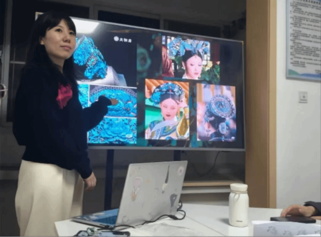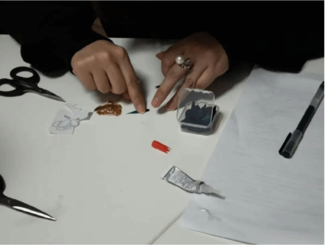 活动开始前石戎睿星老师为我们播放了有关“点翠”的ppt,其中有点翠的历史渊源、技艺特点和制作流程,以及翠鸟几近灭绝的消息,让学生们初步了解点翠这个非遗工艺,也让学生们知道了保护环境的重要性。紧接着老师在现场为学生们展示了点翠的制作方法。活动时,学生们在石戎睿星老师的指导下,亲自动手进行点翠技艺的体验和创作。在制作过程中,学生们刚开始自己摸索,中期互相进行学习与探讨,后期为作品拍照。在此过程中,石戎睿星老师耐心为每位学生解惑,提供帮助。