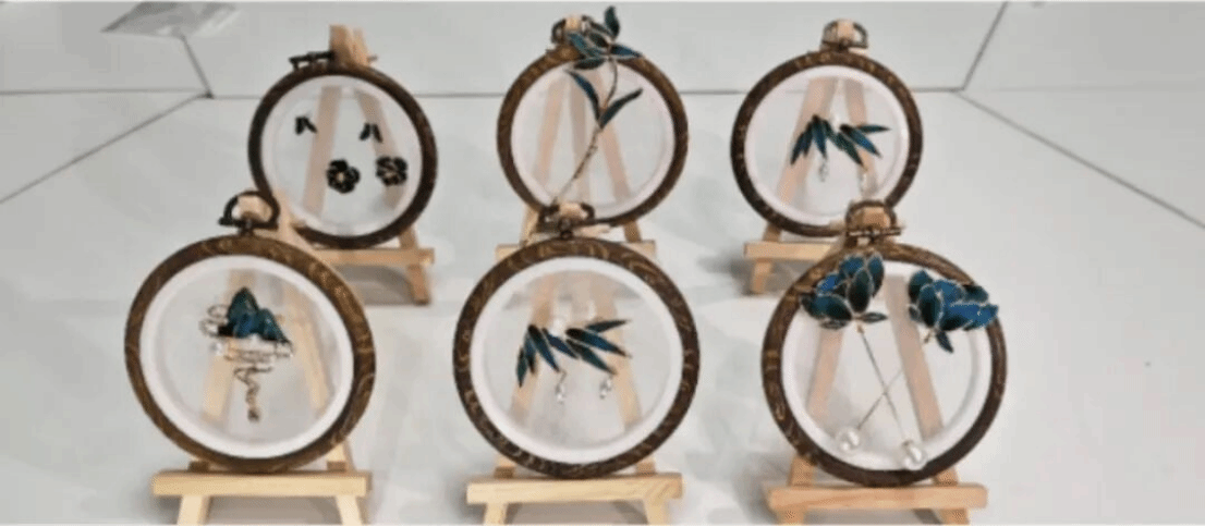 在学生们的展示架上有苍翠欲滴的群山胸针、有栩栩如生的蝴蝶耳钉、有高难度的双层花耳钉等作品。活动用时两个小时,在这期间,学生们都专心致志、心无旁骛、全身心的投入到这次的非遗工艺“点翠”中,为作品拍完照后,活动圆满结束。此次点翠活动的成功举办,不仅让学生们亲身体验了传统工艺的魅力,还提高了他们的文化自信和民族自豪感。在未来的日子里,西安培华学院的学生们将继续努力,传承和发扬传统工艺,为传承中华文化贡献自己的力量。